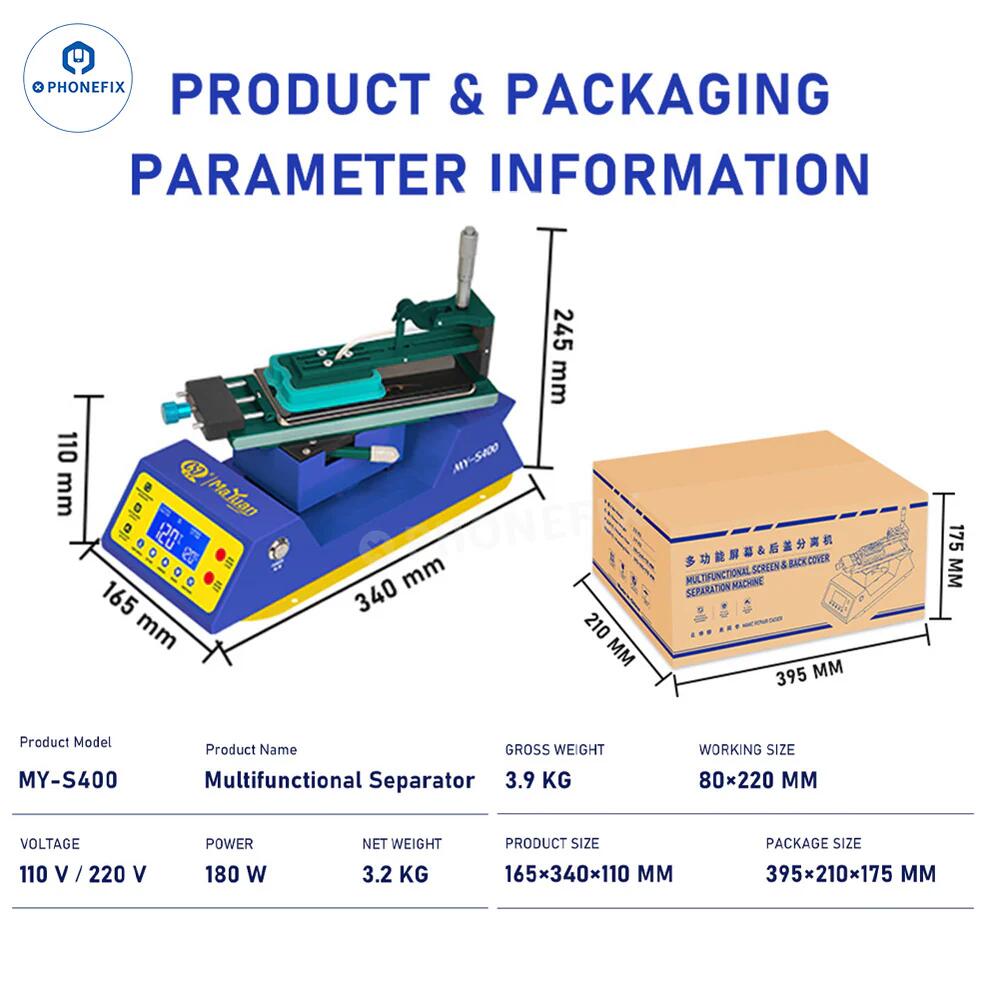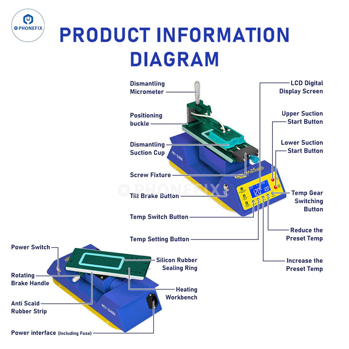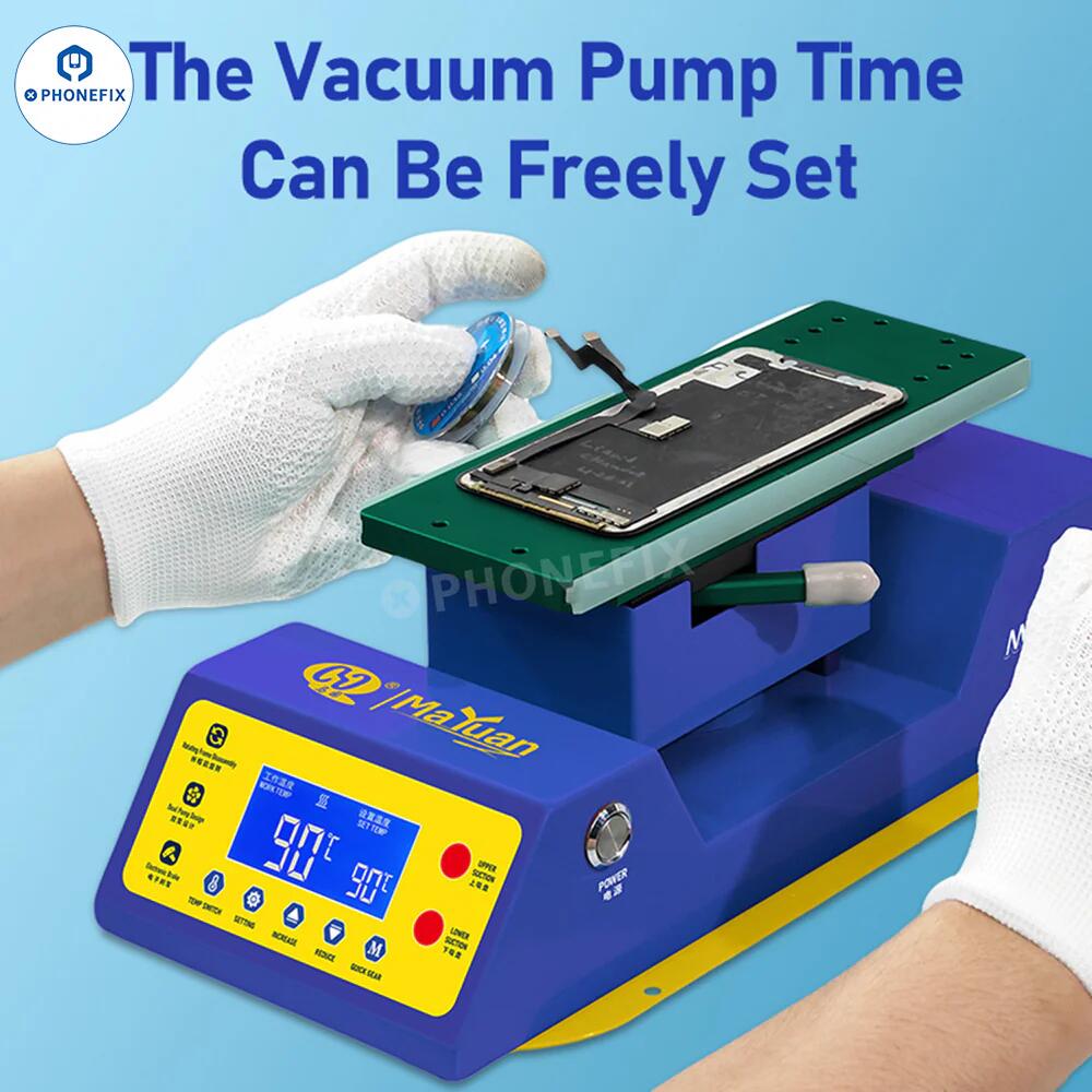 MaYuan MY-S400 Multifunctional LCD Heating Separator with 360-degree rotating platform and powerful suction cups, built-in double vacuum pumps, uniform and stable temperature distribution, suitable for mobile screen heating, screen frame removal, screen separation, glue removal, etc. LCD display, temperature memory, silent design, easy operation.