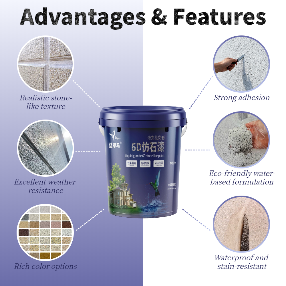 Blue Kingfisher Liquid Granite Stone-Like Paint is a new-type stone-like wall material. It uses water-based acrylic resin as the base material and integrates raw materials such as colored composite rock flakes and natural colored sand. It has realistic stone texture, weather resistance, crack resistance, and excellent stain resistance. It is suitable for scenarios such as villa exterior walls, facades of high-end residences, and building walls in scenic spots. It combines the aesthetics of natural stone with the environmental protection of water-based coatings to help create a high-end building appearance.