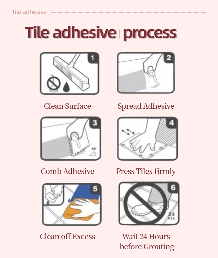 Subsequent treatment: Jointing work can be carried out 24 hours after construction. If the position of the tiles needs to be adjusted, it is recommended to complete it within 4 hours after laying.