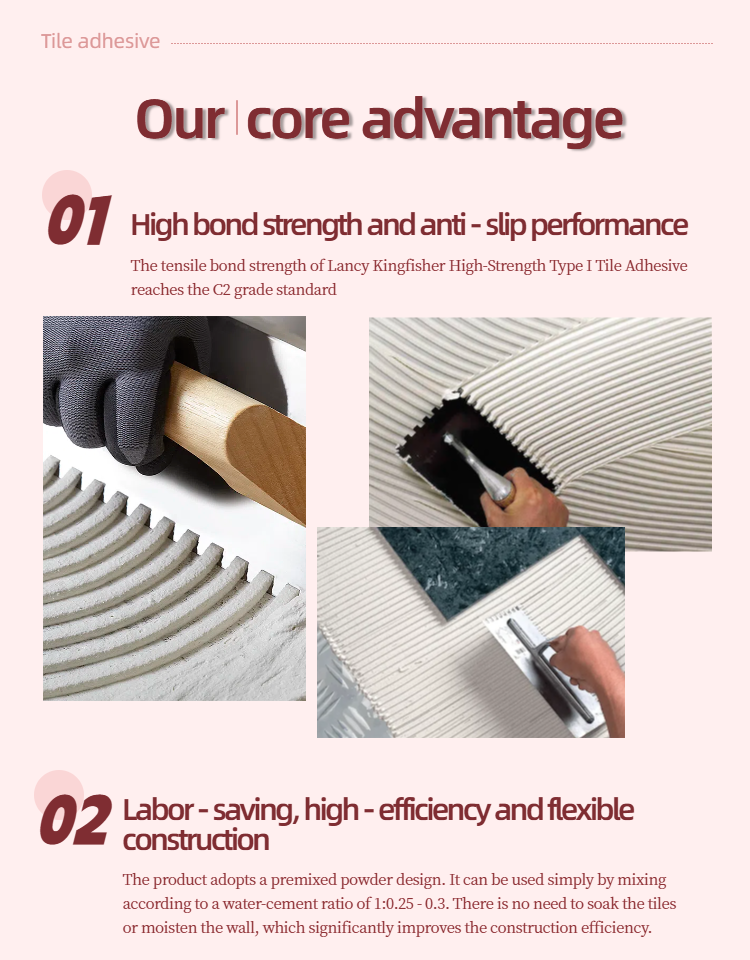 | Blue Kingfisher Tile Adhesive is stable and firm and will not fall off easily | Seller: Zhongshan Blue Kingfisher New Environmental Protection Materials Co., Ltd | Core performance Name:Ceramic Tile Cement Main materials: cement, quartz sand, polymer modifier... | |