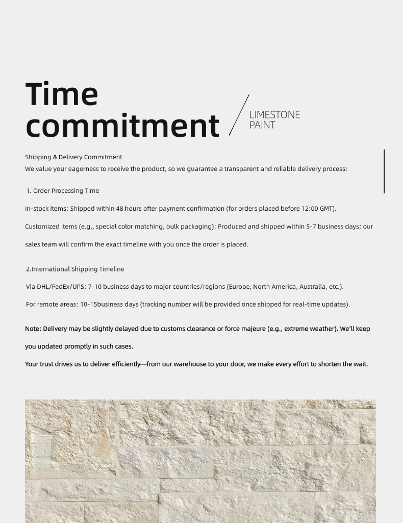 The product form is water-based paint, containing natural colored stone particles.Specifications: 20kg per barrel. Under conditions of 25℃ temperature and 50% humidity, the product achieves surface drying in ≤4 hours and solidification in ≤24 hours. It demonstrates scrub resistance ≥3000 washes, withstanding 24-hour alkali immersion and 96-hour water immersion without abnormalities. Solid content ≥70%, VOC content ≤80g/L, and free formaldehyde ≤0.08g/kg. Application temperature 5℃-35℃, shelf life 12 months, requires cool and dry storage.