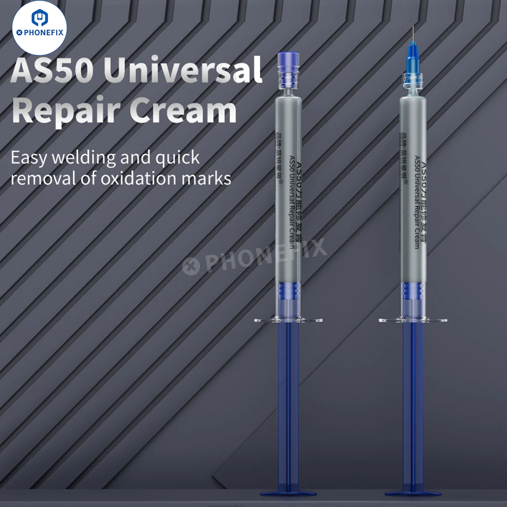LANRUI AS50 通用修复膏,适用于手机/iPhone 主板氧化点去除、FPC 连接器焊接、屏蔽罩焊接、CPU 镀锡脱锡等。AS50 焊膏用于 PCB 焊接,去除氧化痕迹,提升螺丝柱、芯片焊接效果。