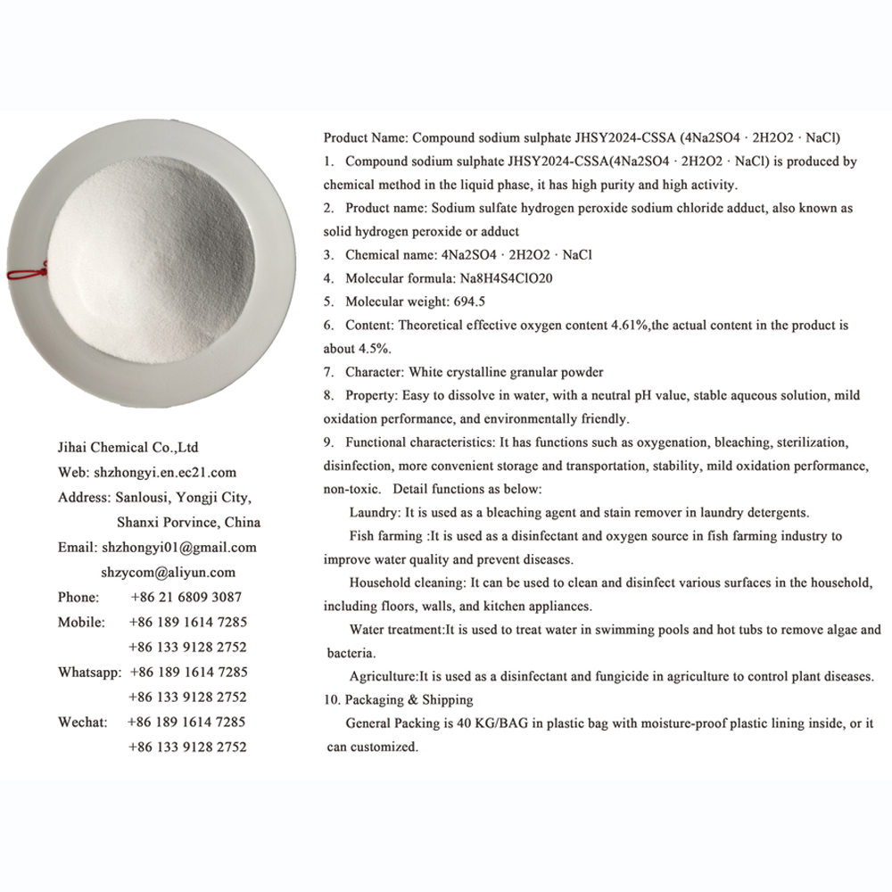 | 硫酸钠-过氧化氢-氯化钠加合物制造商, 分子式4Na2SO4 · 2H2O2 ·NaCl | 卖方: 永济市吉海日化实业有限公司 | 产品描述1. SPS(4Na2SO4 · 2H2O2 ·NaCl)在液相中通过化学方法生产,具有高纯度和高活性。2、中文名称:硫酸钠 双氧水氯化钠加合物,又称固体双氧... | |