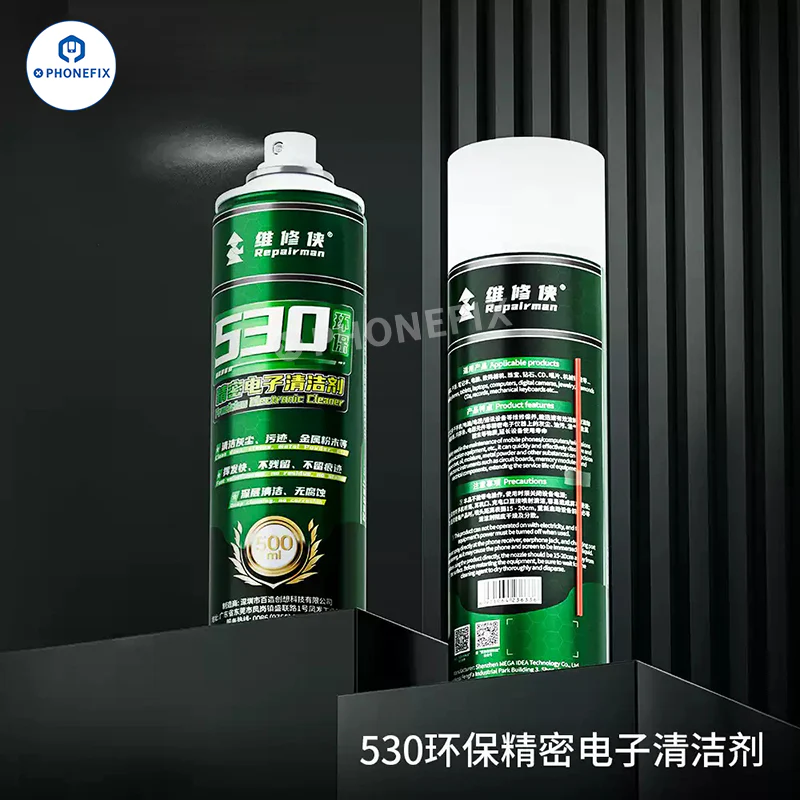 Repairman 530 精密电子清洁剂和 X500 无铅电子 PCB 清洁剂,适用于手机主板、液晶屏、摄像头镜头清洁。Repairman X500 液体清洁剂可深层快速清洁手机主板、电子电路板等。Repairman 530 液体清洁剂可快速清洁手机、iPad、笔记本电脑、平板电脑、电脑、摄像头镜头等设备上的灰尘、污渍和金属粉末。