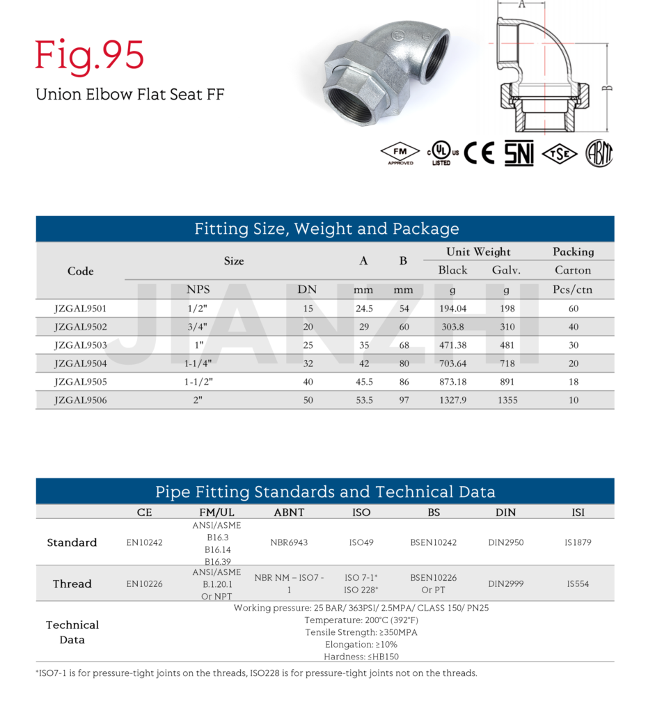BSP平座活接弯头 Fig.95是健志集团提供的众多可锻钢管件产品之一,具备行业内最齐全的型号与规格。该产品广泛应用于给排水系统、石油化工管道、燃气输送系统和管道安装工程。其中,健志的内衬塑管件可安全应用于饮用水系统,兼具耐腐蚀性与卫生性。