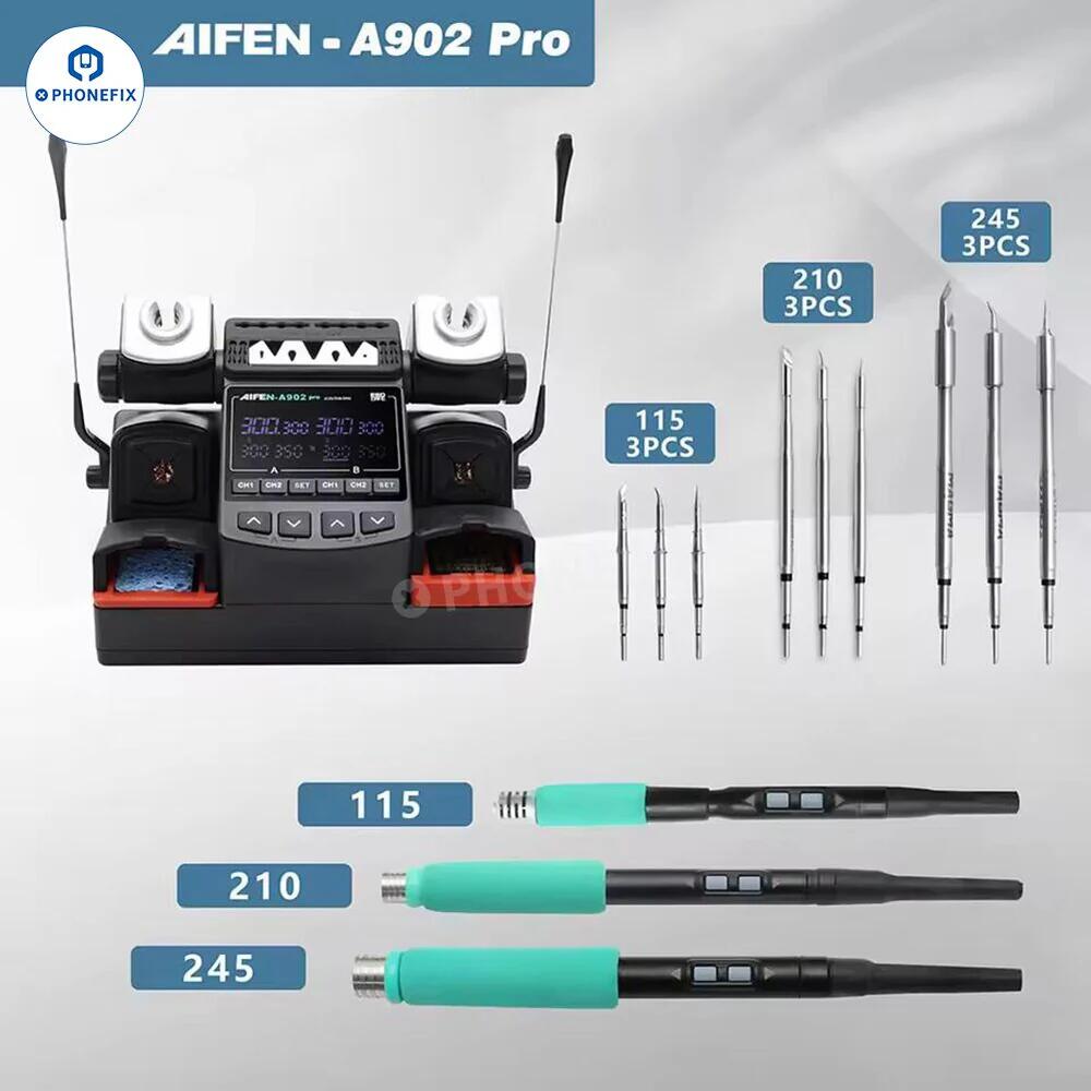 AIFEN A902 和 AIFEN A902 Pro 焊台配备 T115 T210 T245 焊接手柄和 C115 C210 C245 烙铁头,适用于手机维修。AIFEN A902 350W 和 AIFEN A902Pro 450W 双通道 BGA 返修台具有自动休眠功能,兼容 JBC C115 C210 C245 烙铁头,非常适合日常手机/笔记本电脑/PC 焊接维修,例如手机主板 BGA 芯片焊接、拆焊、电子元件焊接维修等。