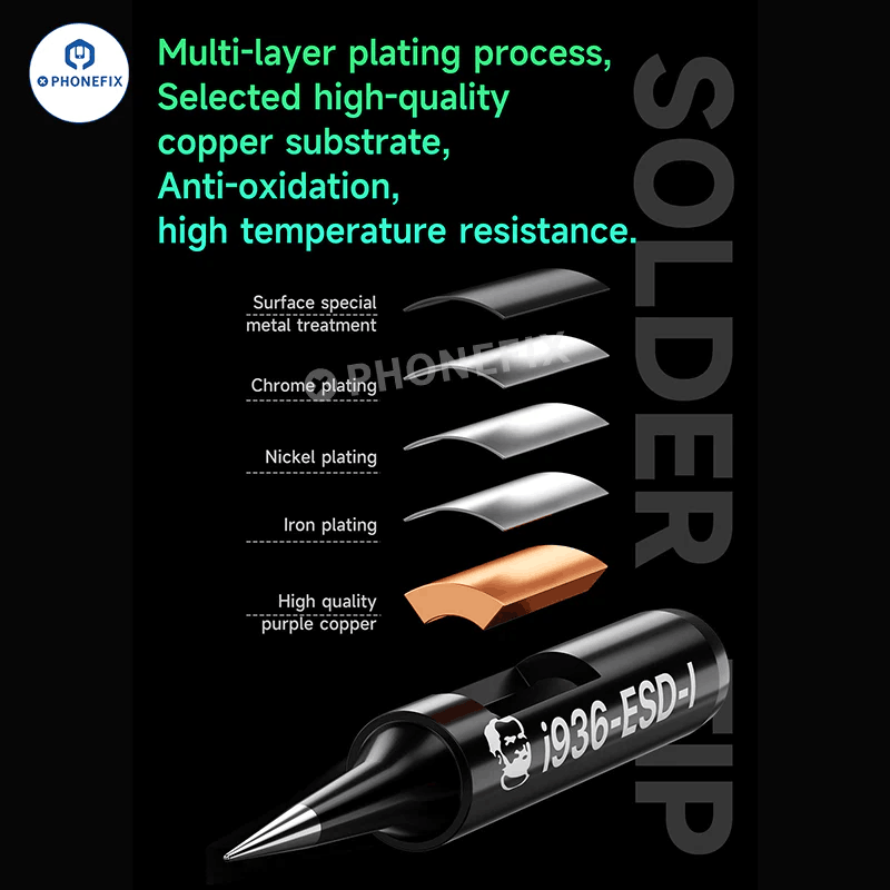Mechanic i936 防静电 ESD 无铅烙铁头,适用于手机主板维修。MECHANIC i936 I IS 烙铁头可用于电子电路板、手机主板、CPU BGA 芯片等的焊接、拆焊、镀锡、除胶、清洁焊盘和回流焊。