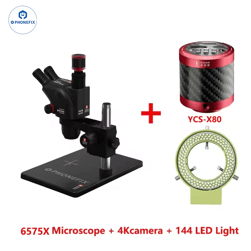 YCS 6575X 6.5-75X 连续变焦三目立体显微镜,配备 YCS X80 4K 摄像头,适用于手机维修。例如手机主板焊接、PCB BGA 芯片焊接、拆焊等。2025 顶级手机维修套装 YCS 6575X 显微镜配备 HDMI 4K 摄像头,可用于维修手机、笔记本电脑和其他电子设备。
