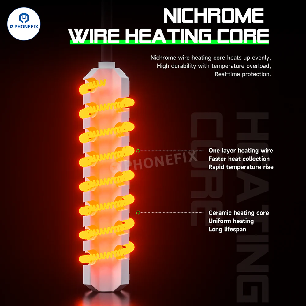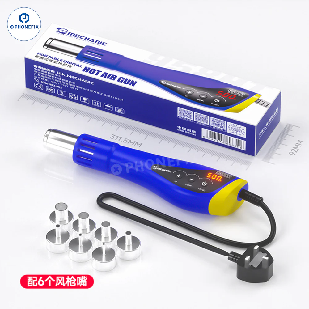 Mechanic 958HT 600W 便携式手持热风枪,配备高清数字显示屏和按键调温功能,适用于日常手机维修,例如手机主板芯片除胶、BGA 芯片拆焊、热缩封装等。广泛应用于电子维修、主板维修、数码产品以及 DIY 制作等场景。