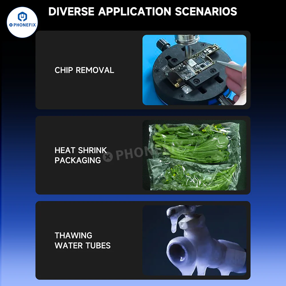 2. 应用场景多样,包括芯片拆卸、热缩封装、水管解冻等。