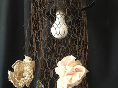 CWL-06:Together with artificial flowers, chicken wire mesh is used a decoration outside the lamp.