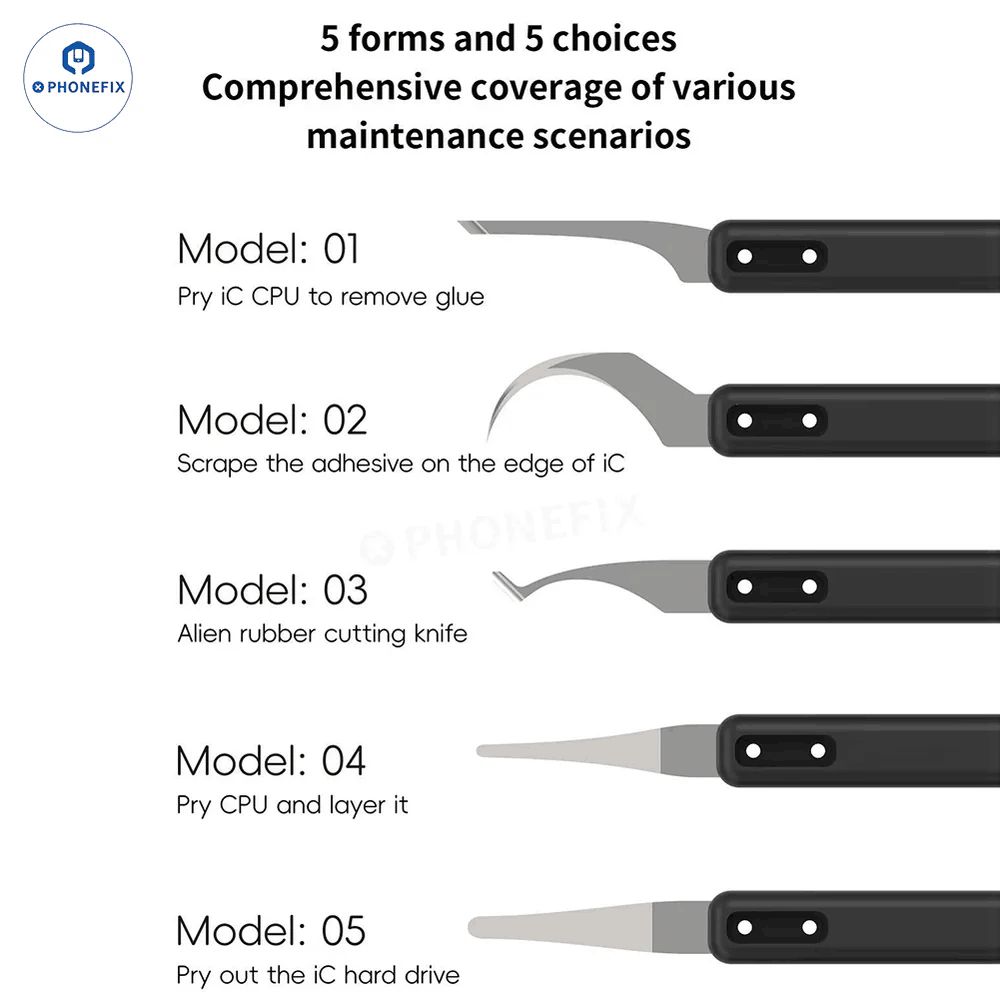 3. 5 种形态,5 种选择,全面覆盖各种维修场景。型号:01 撬开 iC CPU 去除胶水;型号:02 刮开 iC 边缘的粘合剂;型号:03 异形橡胶切割刀;型号:04 撬开 CPU 并分层;型号:05 撬出 iC 硬盘。