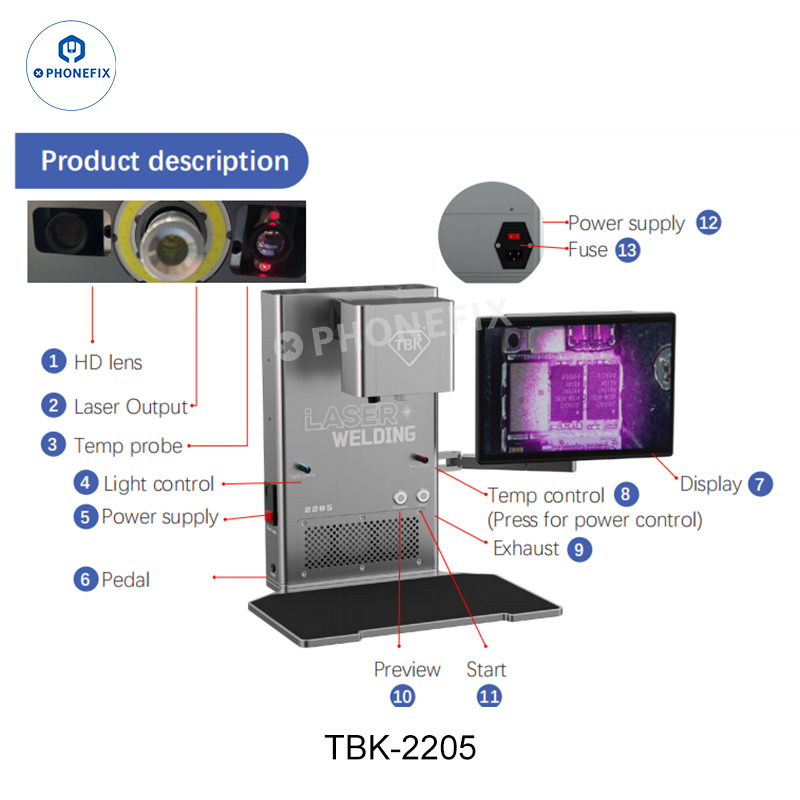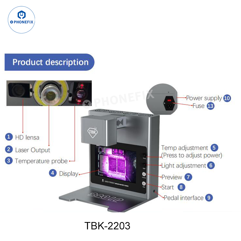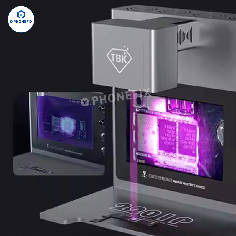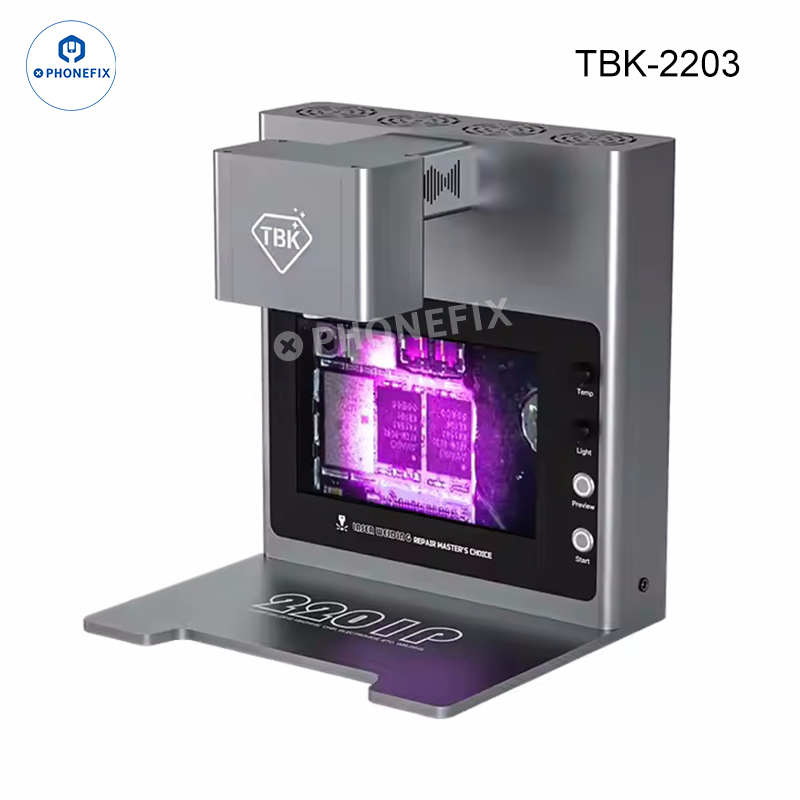 TBK 2203 & TBK 2205 Intelligent Laser Welding Machine with HD lens and display for BGA chip desoldering, glue removal, tinning, jump wire soldering during electronic circuit board and motherboard repair. Laser local heating, infrared thermostat monitoring, heating area range adjustment, can be used with vacuum pen for chip desoldering.