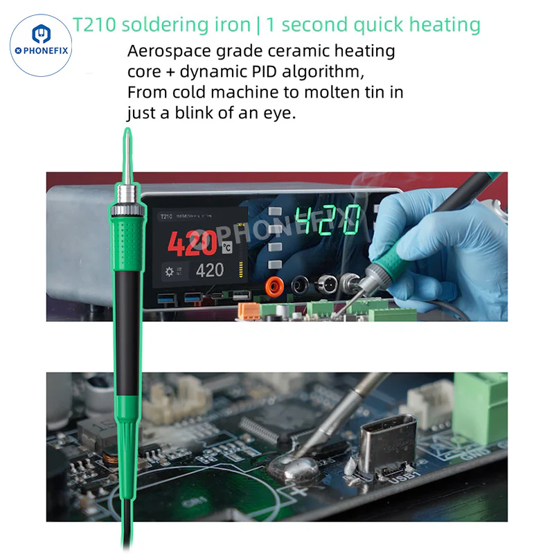 4. T210 soldering iron 1 second quick heating, aerospace grade ceramic heating core + dynamic PID algorithm, from cold machine to molten tin in just a blink of an eye.