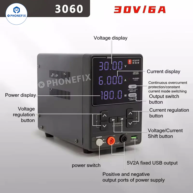 | YCS 3060 Repair Power Supply for PCB Diagnostics | Seller: Phonefix | YCS 3060 30V 6A DC Power Supply delivers 180W high power for tablet/mobile phone motherboard repa... | |