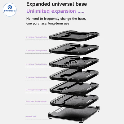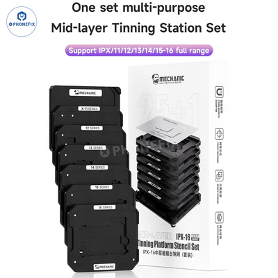 Mechanic Middle Layer Tinning Platform with Mid-frame Stencil for iPhone X/11/12/13/14/15/16 Pro Max motherboard repair. A set of tinning kit with a universal magnetic base, different types of positioning plates and steel mesh is used for iPhone X-16 Pro Max middle layer tinning and soldering. It is an essential tool for mobile repair shops to repair iPhone.