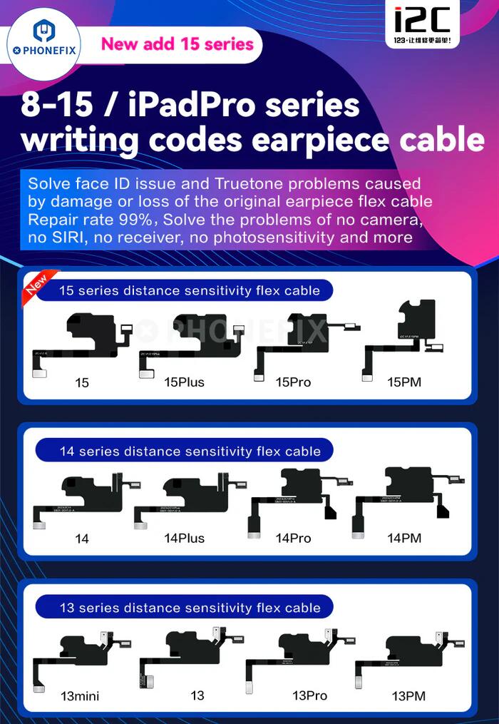 i2C Earpiece Proximity Flex Cable Light Sensor Flex Ribbon Cable, i2C Earpiece Flex Cable mic face ID ribbon flex cable, replacement parts for replacing damaged, broken or unusable Face ID original color problem for iPhone 8-15 Pro Max repair.