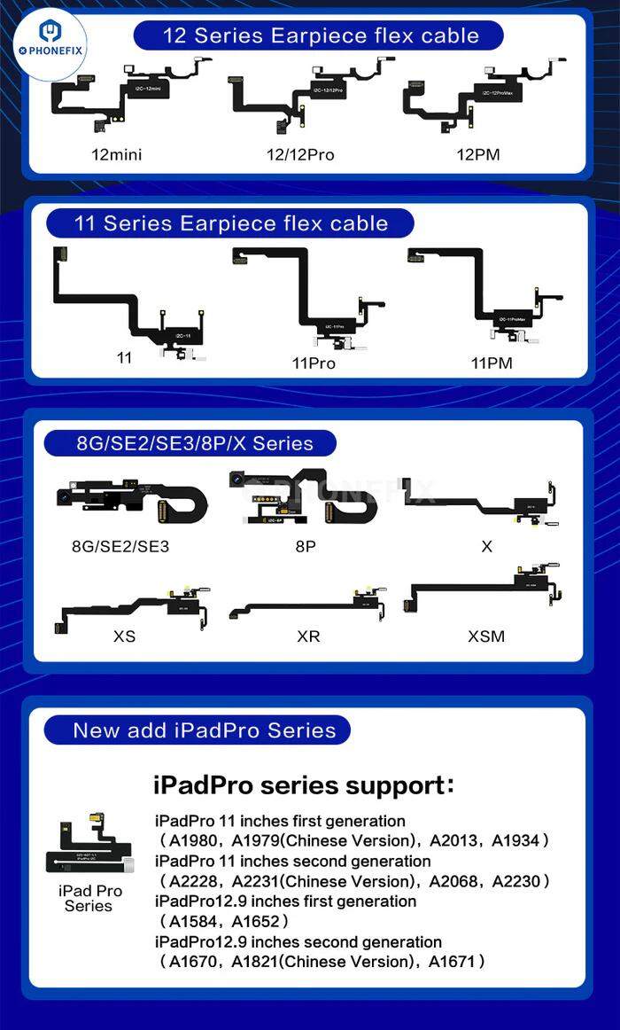 i2C Earpiece Receiver Flex Cable iPhone ear speaker proximity sensor flex cable for iPhone 8-15 Pro Max. i2c Earpiece repair Flex Cable Receiver Sensor Repair Test Flex Cable for repairing damaged iPhone earpiece and ambient light sensor flex cable, high quality iPhone earpiece with front sensor flex cable replacement accessories. Can be used with i2C A8S Programmer and earpiece repair board.