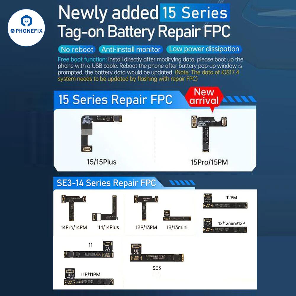 JCID has released iPhone 15 Series Tag-on Battery Repair FPC Flex Cable. JC battery repair tag-on FPC cable for iPhone 15/15Plus/15 Pro/15 Pro Max, no reboot required, anti-install monitor, low power dissipation. - Updated on April 3, 2024.