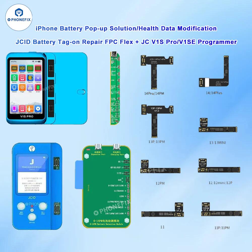 JC Battery tag-on repair FPC flex cable for iPhone 11-15 Pro Max non-genuine iPhone battery pop-up windows removal and battery health data modification. JCID battery repair FPC upgrade technology has clear voltage reduction and capacity locking functions, which solves the problem of iPhone battery incomplete charging and rapid power loss due to voltage limitations.