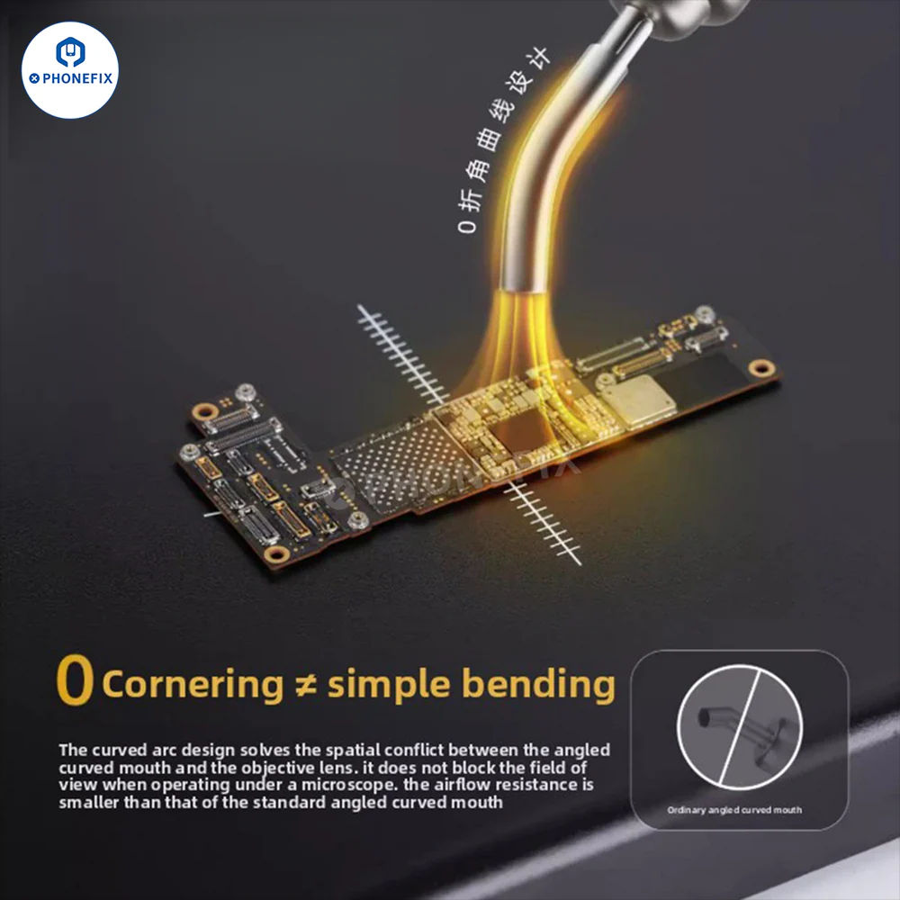 YCS 5mm/6mm/8mm/10mm 弯曲气枪喷嘴可有效解决智能手机维修过程中显微镜曲面部分与物镜之间的空间冲突,确保显微镜下视野清晰无阻。该喷嘴兼容多种热风枪,并可适应不同的工作环境,适用于智能手机主板维修、CPU BGA芯片拆卸等作业。