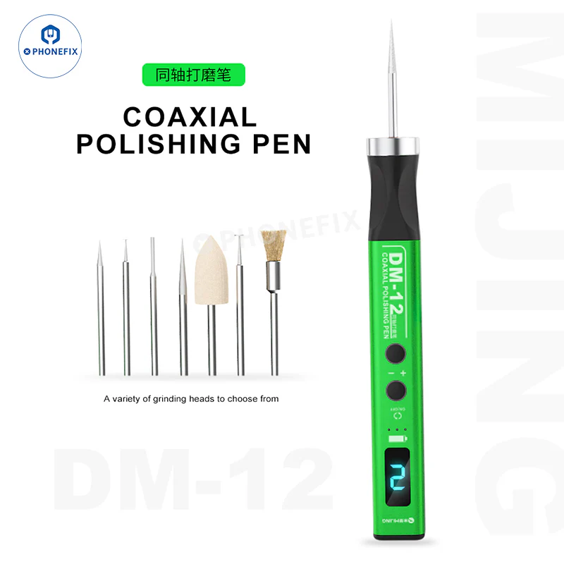 Mijing DM-12 Coaxial Polishing Pen with 7 Grinding Heads is designed for motherboard chip grinding, board polishing, shield cover cutting, and dust removal. This electric grinding pen serves as a fundamental repair tool for mobile repair shops and other electronic circuit board repair shops.