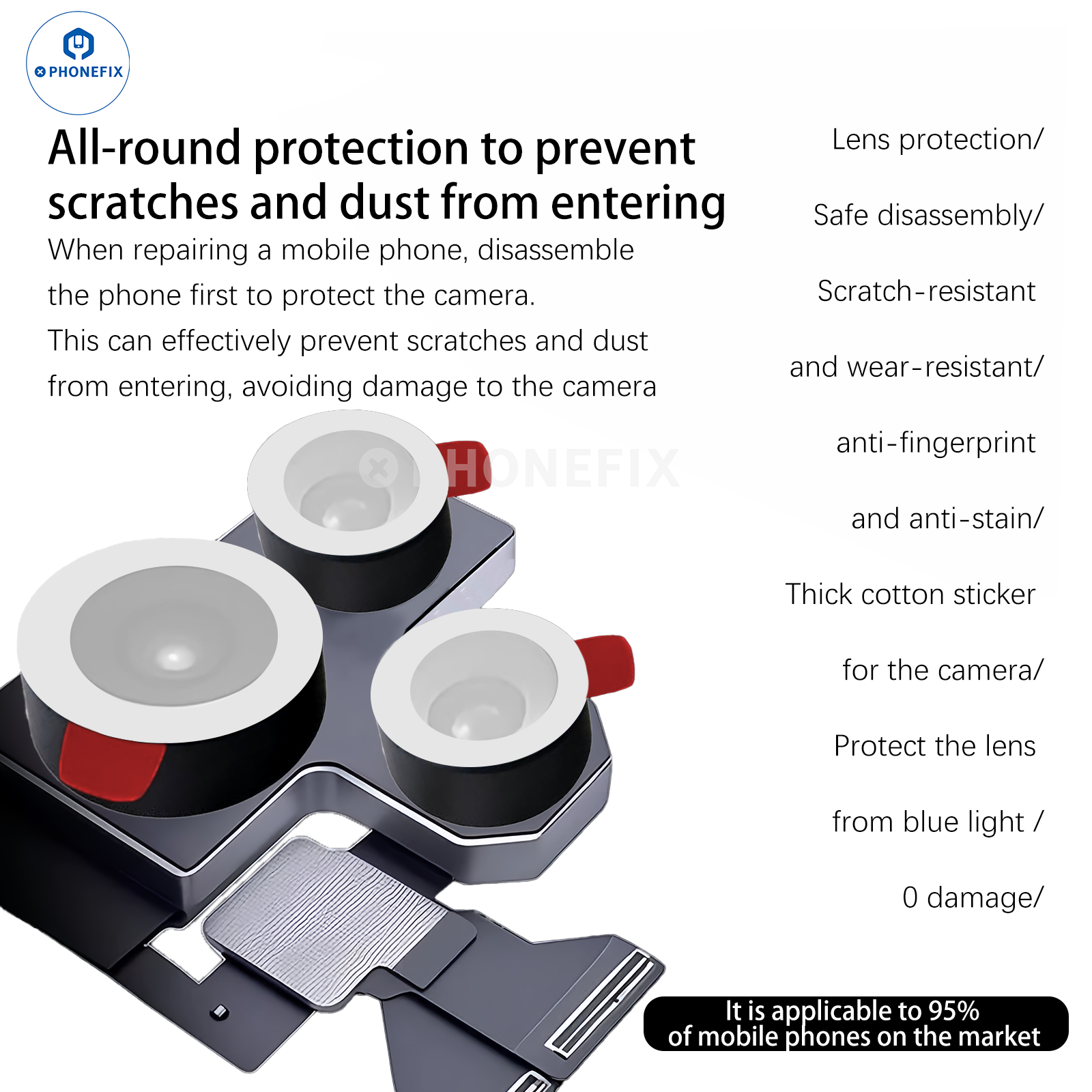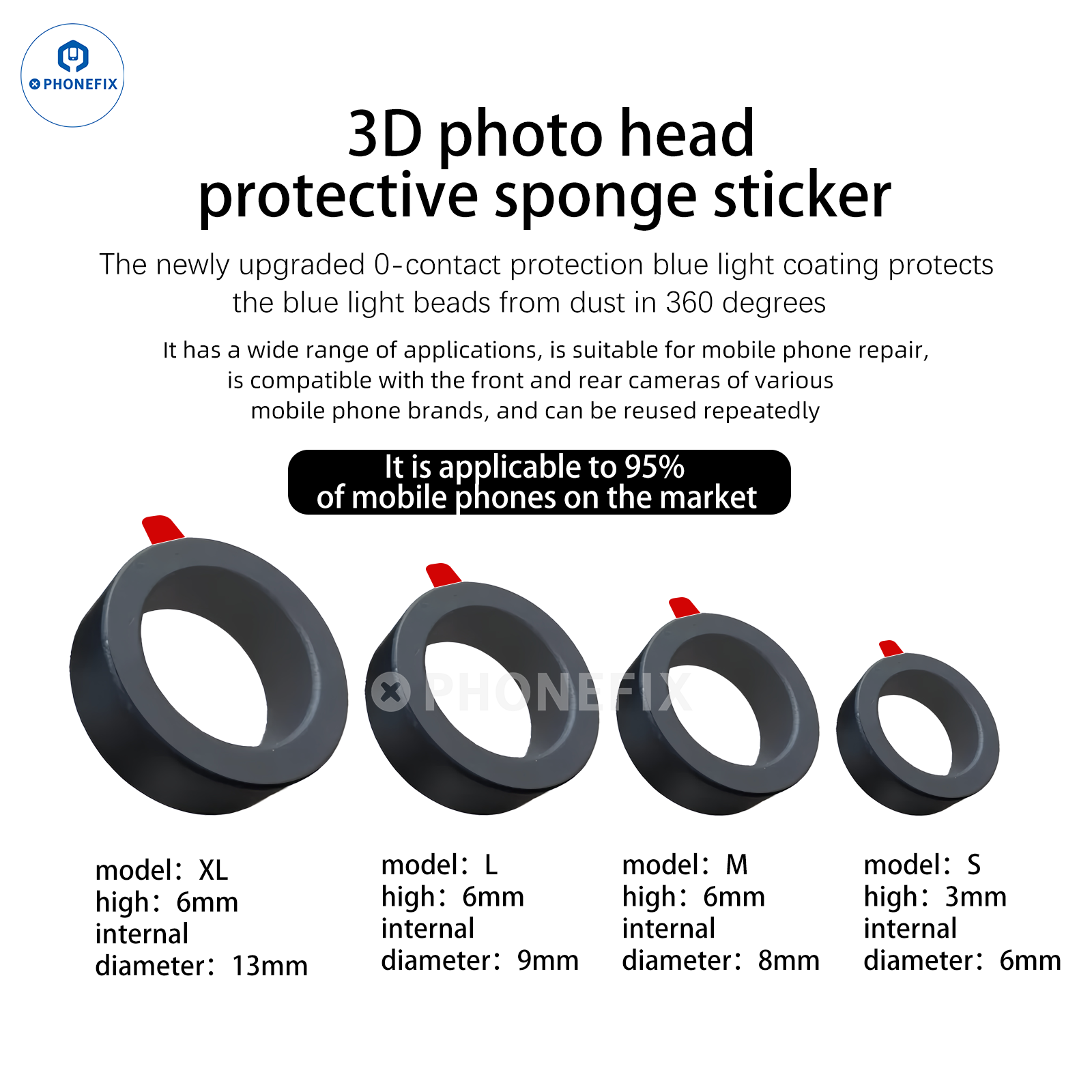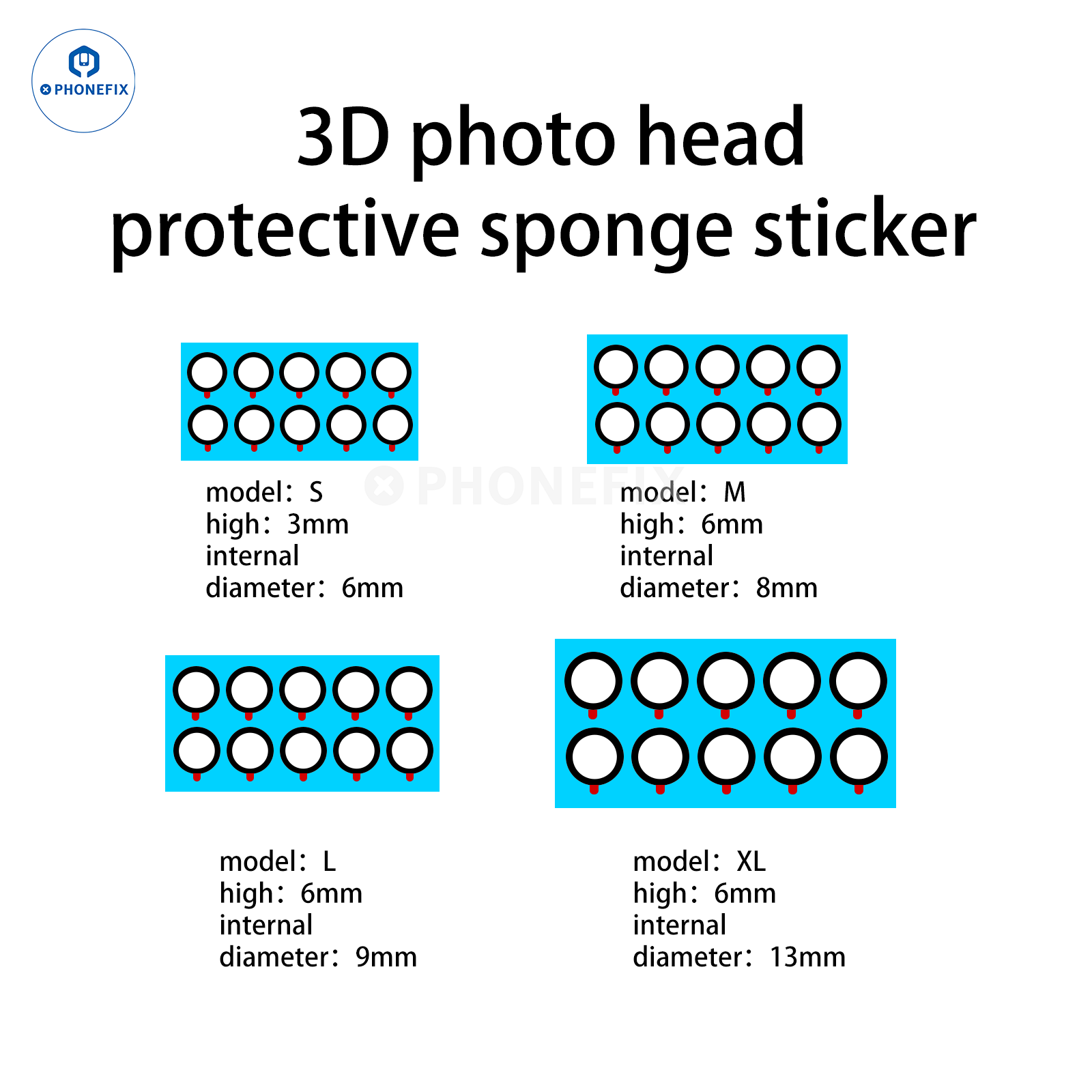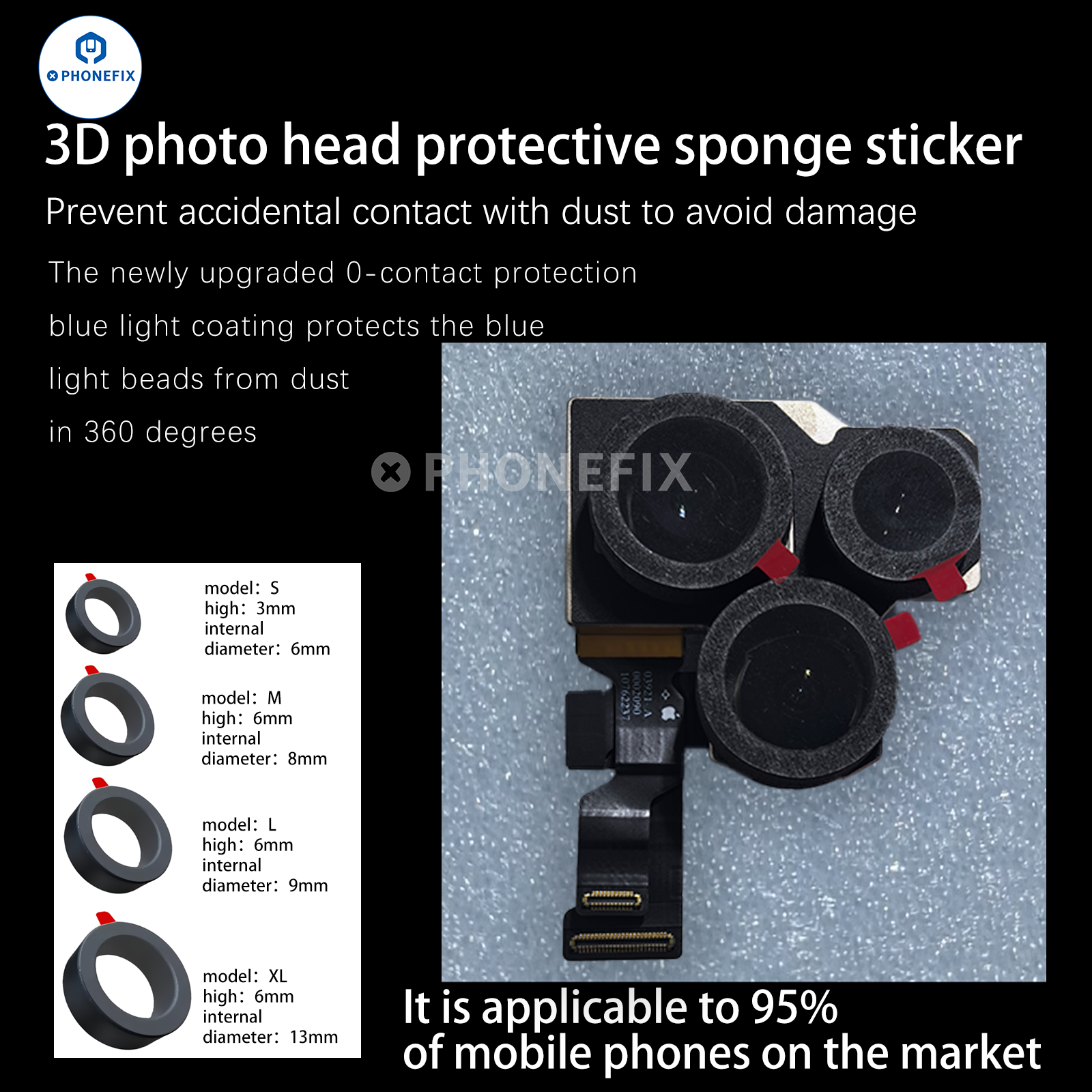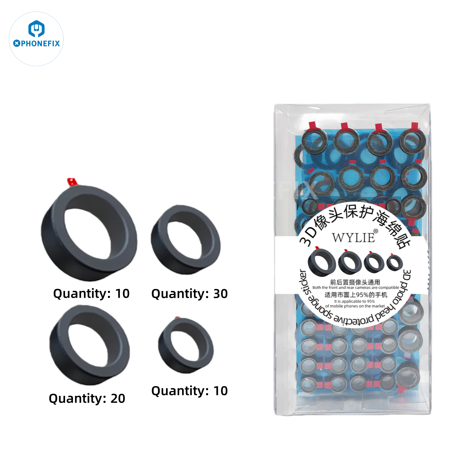 WYLIE 3D Camera Protective Sponge provides 360-degree protection for the mobile 's front and rear cameras, effectively preventing common problems like scratches, dust, fingerprints, and smudges. Its zero-contact blue light bead design effectively reduces lens damage. WYLIE 3D Camera Protective Sponge Stickers, including 3mm and 6mm heights and 6mm, 8mm, 9mm, and 13mm diameters total 70pcs per box. Compatible with 95% of models, it's suitable for repairs and camera protection.