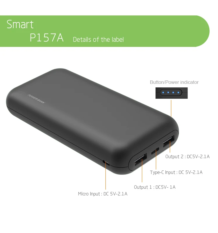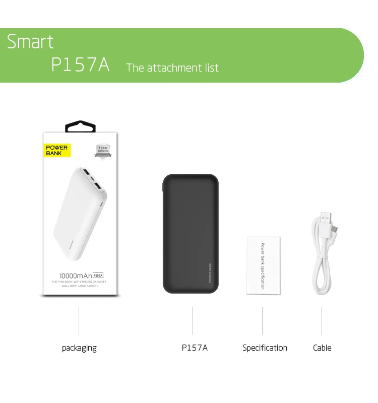 Overview Quick DetailsCertification:CE ROHSOutput Interface:Double UsbInput Interface:Micro USB, USB Type CSupports Solar Energy:NoType:Ultra Slim, High Capacity, Portable, USB Universal Portable Power Bank, USB UniversalBattery Type:Li - Polymer BatteryPlace of Origin:Guangdong, ChinaBrand Name:OEMModel Number:P157A - Y23 - 16000MAHWeight:370GSocket Standard:Universal, Micro USBProtection:Over - discharging, Short Circuit Protection, Over - charging, Low Tension, Over power ProtectionFunction:Provide PowerSupport devices:Mobile Phones DevicesMaterial:ABS + PCBattery capacity:16000mahCharging time:6 HoursCycle Life:500timesLogo:Customized Logo PrintingCell type:Li - Polymer Grade: A + +Warranty:12 MonthsSocket Type:USB PortIs LED Lamp Illumination:NoDimension:L145 * W68 * H25mm Supply Ability Supply Ability: 20000 Piece/Pieces per Day Packaging & Delivery Packaging Details 1. OEM/ODM Custom Design