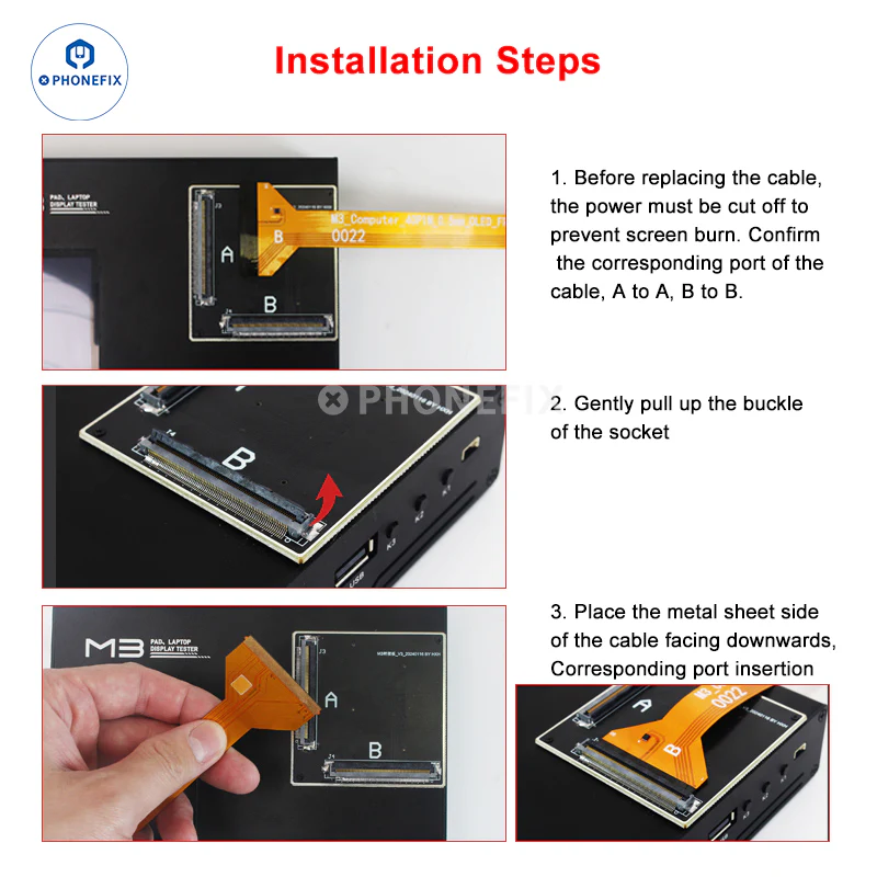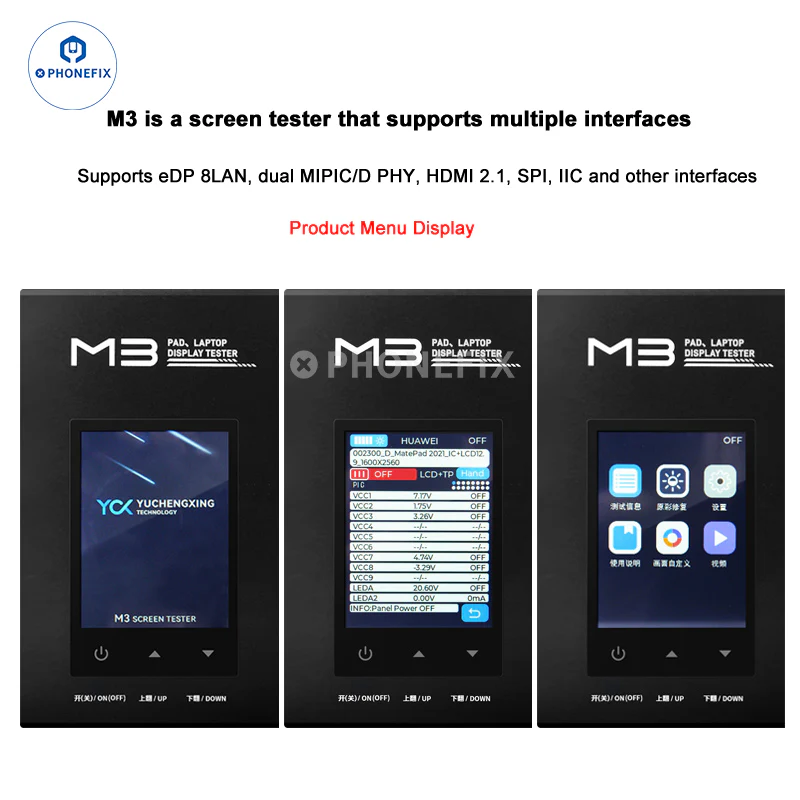 The M3 tester’s primary function is to efficiently check the display and touch functionality of screens for MacBooks, iPads, and other tablets and laptops without needing the original motherboard.