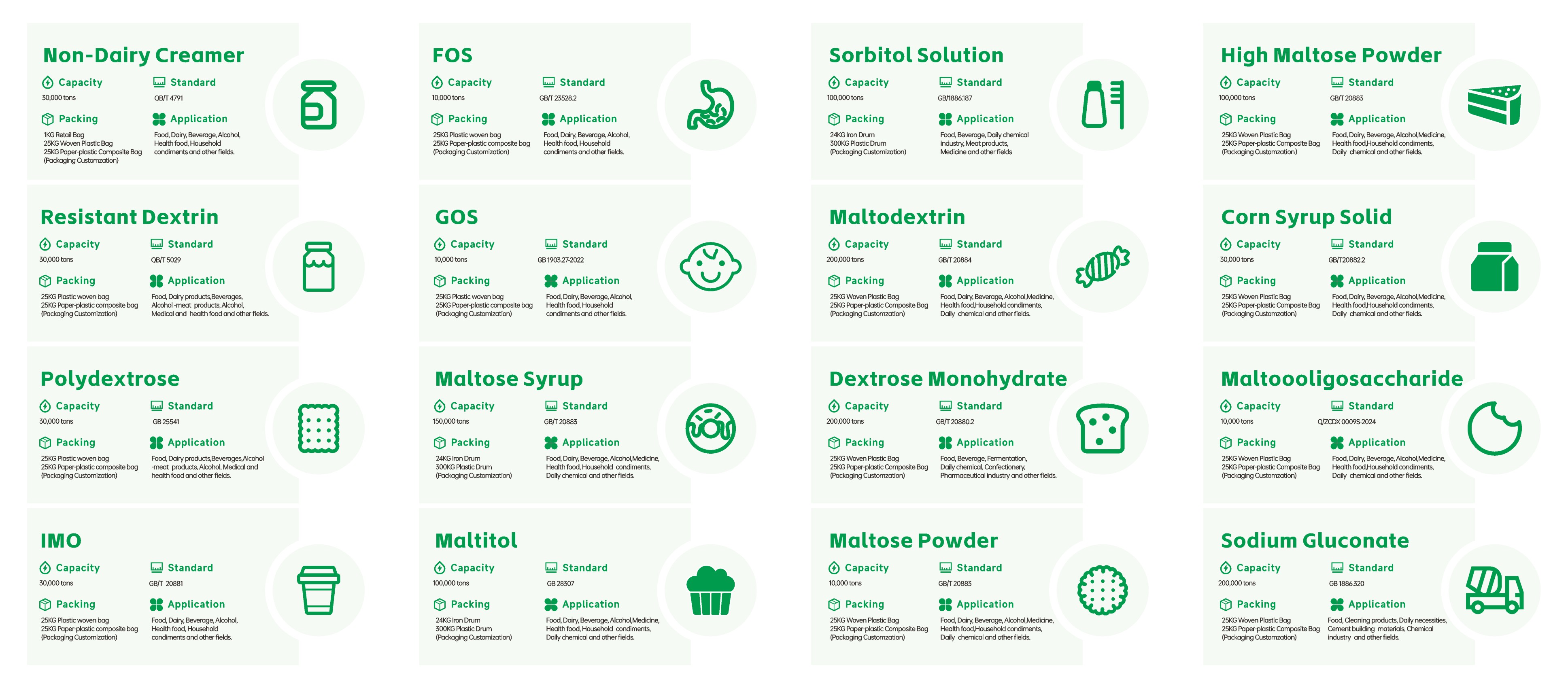 (пищевая глюкоза, сорбитол, мальтовый сироп, мальтодекстрин, эритритол), животные питательные добавки (лизин 70%/98%, треонин, аргинин, валин, лейцин, изолейцин, цитруллин, кормовые хлопья из кукурузы, кукурузный белковый порошок) и органические кислоты (глюконат натрия