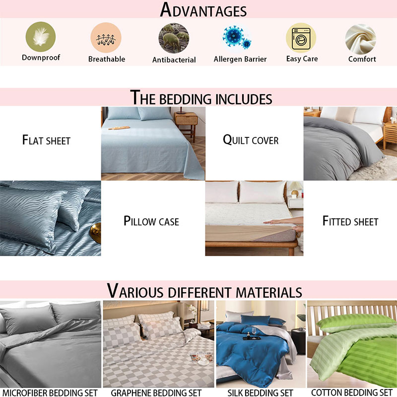 Features:Anti-wrinkle, Durability, Breathable, Down proof, Anti bacteria,Anti dust mite,etc.