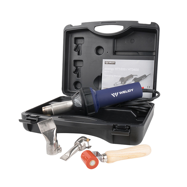 The Weldy HT 1600 heat gun can also be purchased in three other editions as a complete set. The "plastic kit" variant, including a 5 mm / 0.19 inch tube nozzle and a 4 mm / 0.16 inch quick welding nozzle; the variant "overlap kit" has two overlap nozzles, each 40 mm and 20 mm / 0.8 inch, and a silicone pressure roller. Last, but not least, the "shrinkage kit" is equipped with two overlap nozzles, 40 mm / 0.16 inch and 20 mm / 0.8 inch, and a reflector nozzle. The Weldy manual welding kits are supplied with operating instructions in 28 languages and a durable plastic tool case. In the standard design, Weldy HT1600 has cardboard packaging.