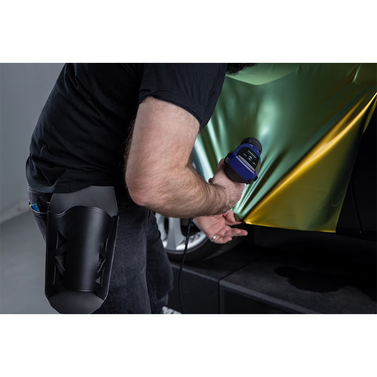 Whether full or partial wrapping, car wrappers have the right tools in one practical kit. The ergonomically shaped HG 530-A heat gun weighs only 750 g and makes it easy to work on projects for extended periods of time. In the HG 530-A car wrapping kit, the HG 530-A heat gun is equipped with a 5 m long cable and offers users even more freedom when working. An advantage that pays off when wrapping different vehicles. In addition, both temperature and air volume can be precisely set via its digital display. Another useful feature of this handy heat gun is its ability to set, save and recall up to five different temperature and air volume settings for specific projects and material. When users take a break from their work, Eco-Mode activates and reduces the air flow, while maintaining the set temperature. This means that the HG 530-A is quiet during breaks and saves energy and costs. When the heat gun is picked back up, the air flow immediately increases to the setpoint. Eco-Mode can be set according to the user's needs, either time-controlled or according to the positioning of the hot air blower (90° angle downwards). Setting Eco-Mode according to specific angle positioning is recommended when using the leather holster (article no. 126.311) to hold the heat gun. To prevent users from injuring themselves or damaging sensitive wrap materials due to the hot heating tube, the heat protection is included in the set. The practical, protective basket is simply placed on the heating tube of the Weldy heat gun and ensures increased safety. The two air intake covers are also easy to clip on. They ensure that the air continues to be sucked in unhindered when, for example, car wrappers briefly tuck the heat gun under their arm or between their legs while working. In this context, Weldy's leather holster has proven to be a helpful accessory. Simply attached to the belt, the holster is used to hold the heat gun when taking breaks. As soon as the HG 530-A is placed in the holster, it switches to Eco-Mode (if it’s activated and set to positioning). This means that the heat gun always remains within reach when working and is immediately ready for use when it is pulled out of the holster. The HG 530-A car wrapping kit is also ideal for repairing bumpers, plastic covers and spoilers, for working on leather interior in cars and for removing wraps. Even shrinking cables and loosening of screws are within the range of applications of the versatile Weldy car wrapping kit.