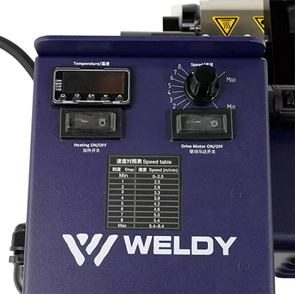 All keys are labeled bilingually (English and Chinese). Heating and motor can be turned on and off directly with the controls, which enables fast, safe and intuitive operation. By means of a temperature sensor placed in the middle of the wedge, the welding temperature can be precisely controlled at any time during overlap welding. The WGW 300 automatic welder is equipped with a powerful and durable motor. Its strong drive rollers ensure a secure grip when reliably welding membranes on inclines that are almost vertical. Thanks to the large rollers, this Weldy hot-wedge welding machine achieves high-quality welds on both even and uneven surfaces. The WGW 300 from Weldy is inexpensive to purchase and manages the balancing act between price and quality, making it stand out positively in its market segment. The automatic welding machine is suitable as an inexpensive, entry-level tool for plastic welding in mines, landfills and various engineering projects. The robust hot-wedge welding machine, WGW 300 from Weldy, weighs 15 kg and can be easily stored and transported in the storage box supplied. *A steel wedge is required for welding PVC geomembranes.