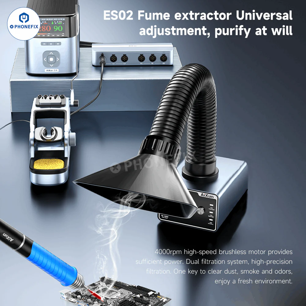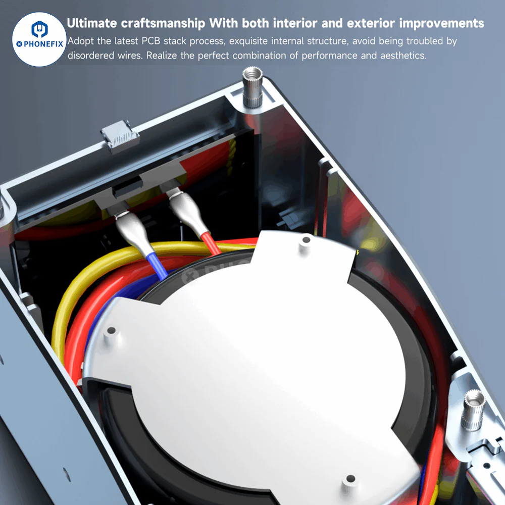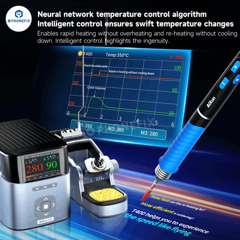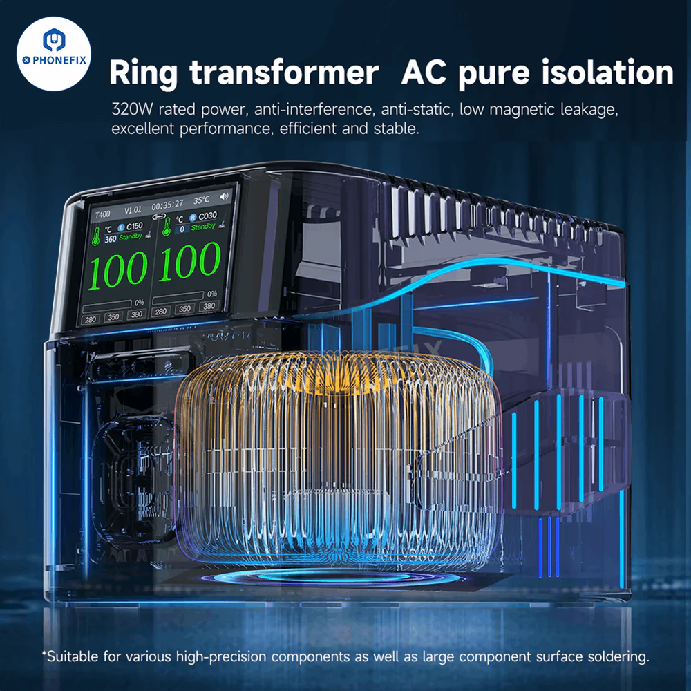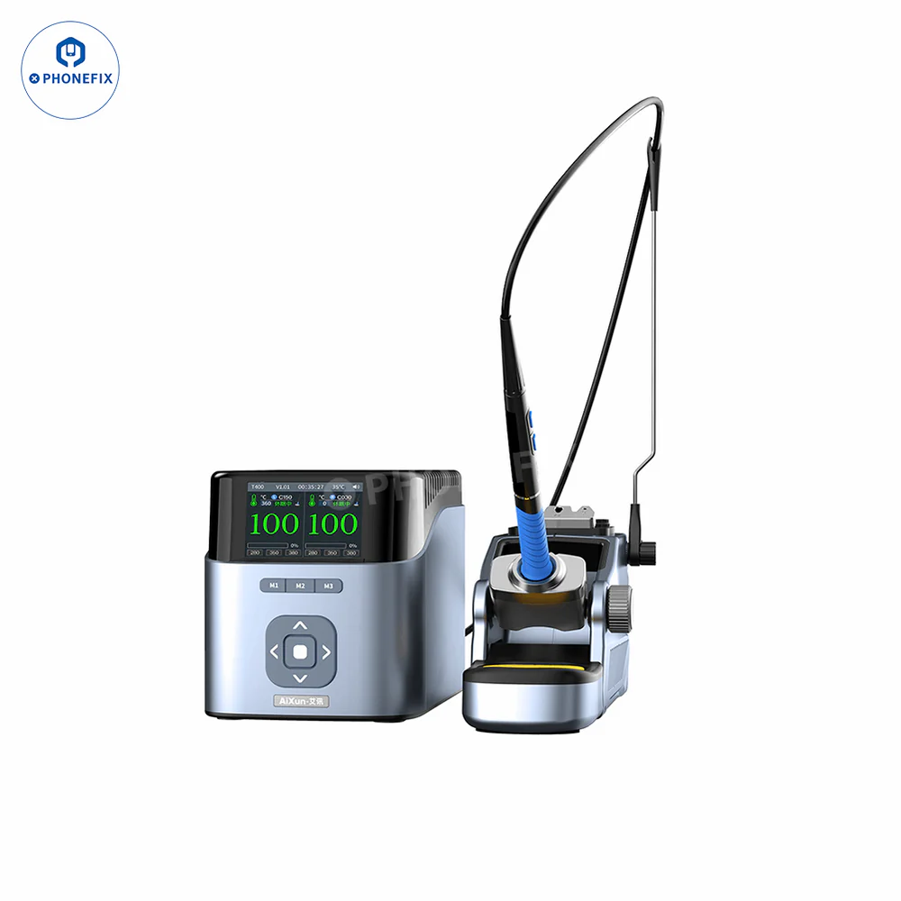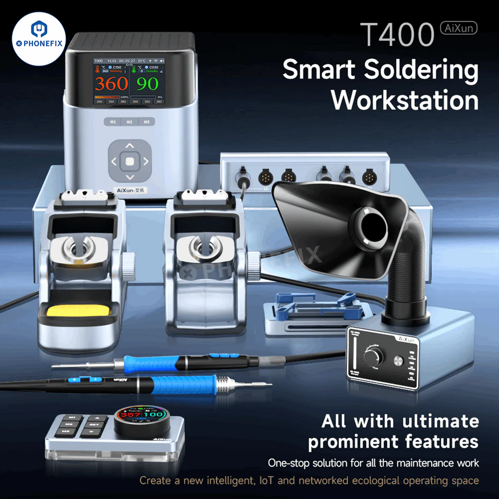 AiXun T400 320W Smart Soldering Workstation compatible with T225 handle and 4 types of soldering iron tips C030-C080-C150-C250. Supports WiFi OTA upgrade and can connect up to six devices with the 6-in-1 docking station at the same time, for high-precision PCB component welding and large surface repair.