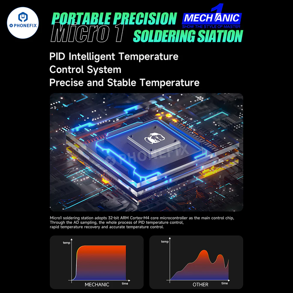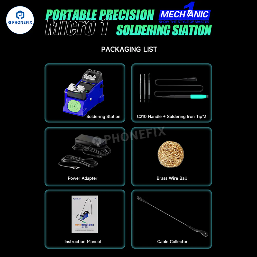 Mechanic MICRO 1 Portable Precision Soldering Station compatible with T210 T115 T245 handle and C210 C245 C115 iron tips for mobile repair. Heat up in 2 seconds, melt tin in 3 seconds. PID temperature control system, precise and stable temperature, LED color display intuitively presents parameters. Intelligent sleep mode. Suitable for Mobile Phone/Tablet/PC motherboard welding and repair.