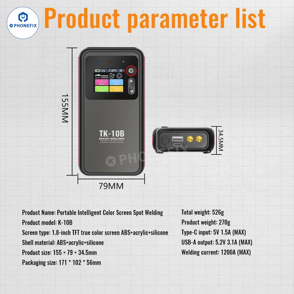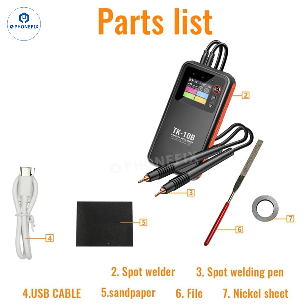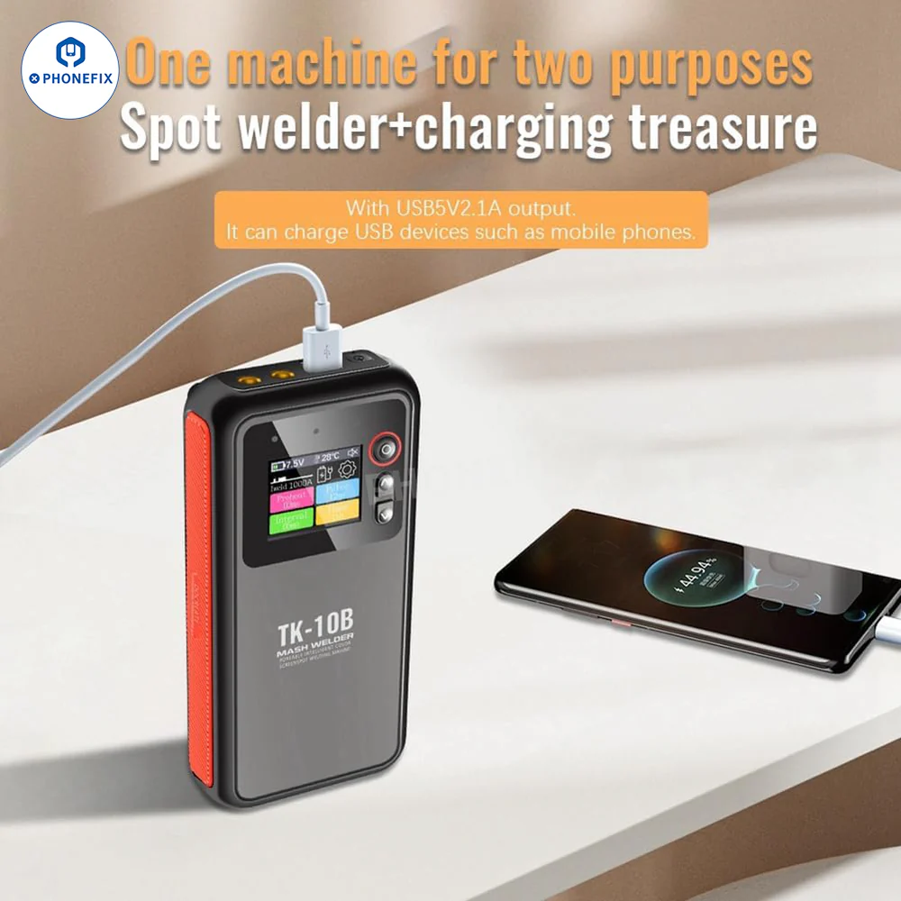 TK-10B Portable Spot Welding Machine and 80 Gears Adjustable Handheld Spot Welder Portable Digital Display Mini Spot Welding Machine for Mobile Phone/iPhone Battery Replacement or Repair. TK-10B Spot Welder features spot welder+charging treasure, suitable for mobile battery repair.