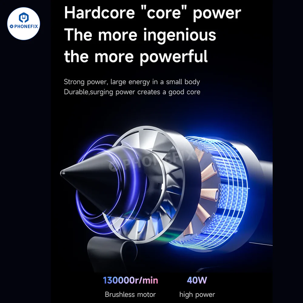 6. Super high-speed hurricane, surging power Applying high-speed air duct design, driven by 130,000RPM high-speed brushless motor. Pushes outside air towards the center, doubling the outside airflow.
