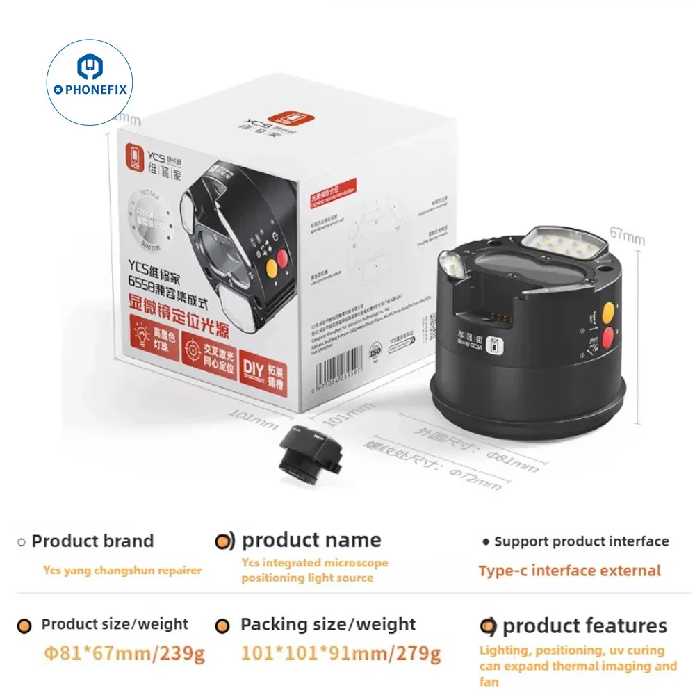 YCS 6558S Trinocular Stereo Microscope features a 6.5X-58X zoom objective lens, 10X/23 eyepieces, 0.5X CTV adapter and a large base, suitable for mobile micro-soldering repair, such as motherboard welding, CPU BGA chips soldering and repair. YCS 6558S Trinocular Microscope can be used with a 4K camera and swing arm to improve the efficiency of mobile repair.