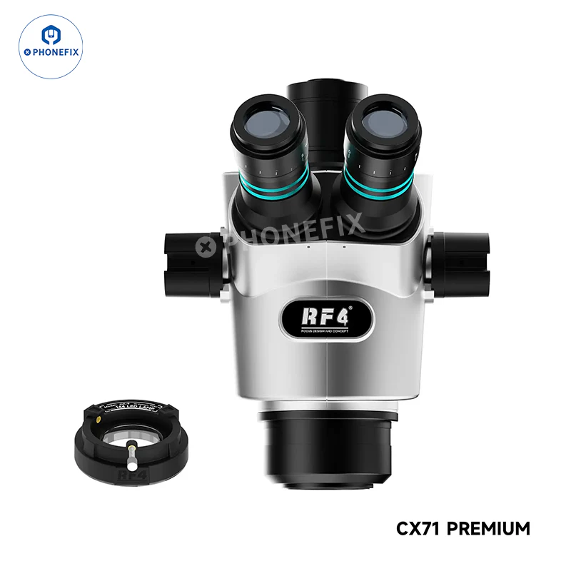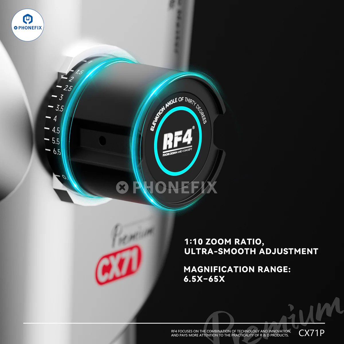 RF4 CX71 Premium 6.5X-65X Trinocular Stereo Microscope compatible with FO24 Stand and HDMI Camera for Mobile Phone Repair. RF4 CX71P Dual-Anti fatigue trinocular stereo microscope features WF10X/23 eyepieces, iris-coated objectives, and a 30° scientific tilt angle design, making it ideal for mobile motherboards BGA chips soldeirng and repair.