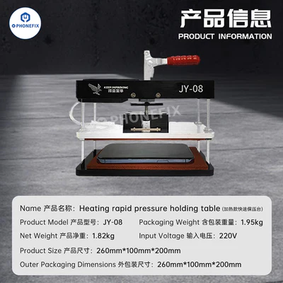 Universal Recovery Airtight Heating Pressure Maintenance Machine JY08 Heating Rapid Pressure Holding Table has a heating function that can quickly restore the airtightness of the mobile . It adopts a convenient manual design and the pressure height is adjustable. It is suitable for iPhone screen/bracket frame/back cover hot pressing, airtightness restoration and pressing of mobile s.
