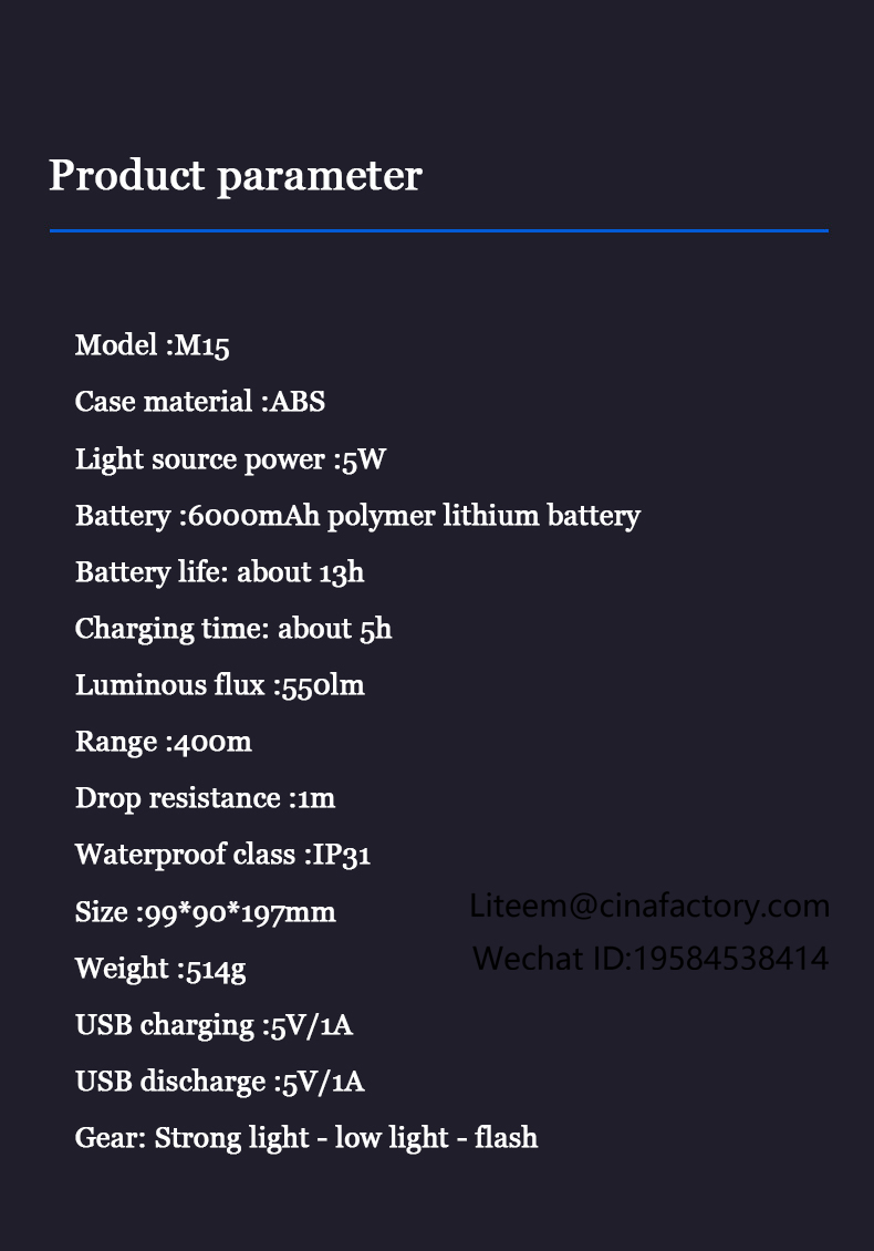 Name:LITEEM FSS10 Searchlight Model: M15 Case material : ABS Light source power : 5W Battery : 60oomAh polymer lithium battery Battery life: about ... |