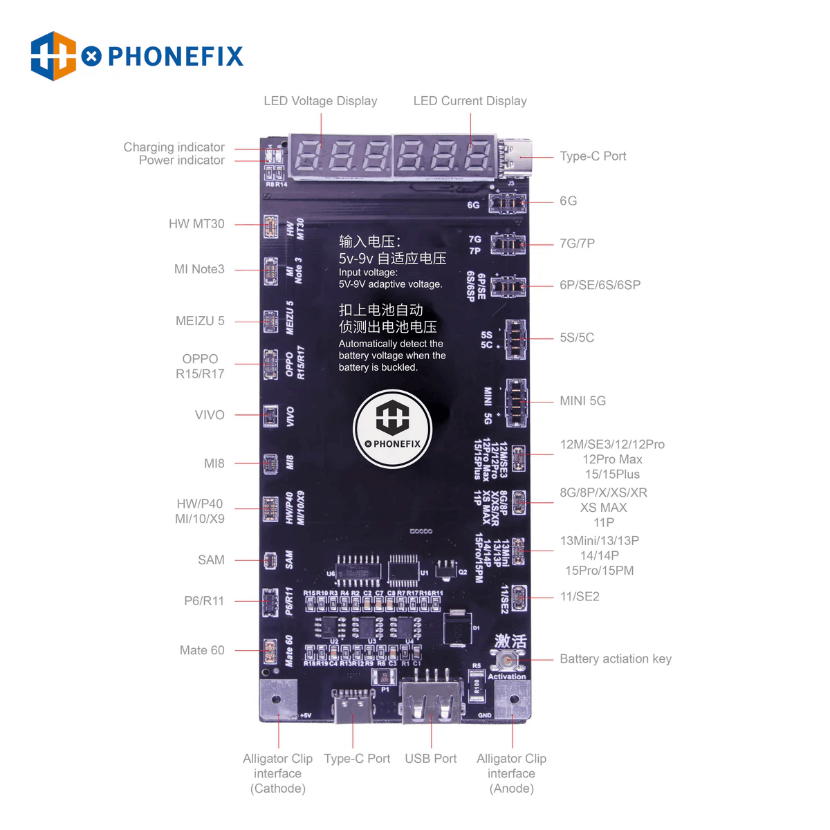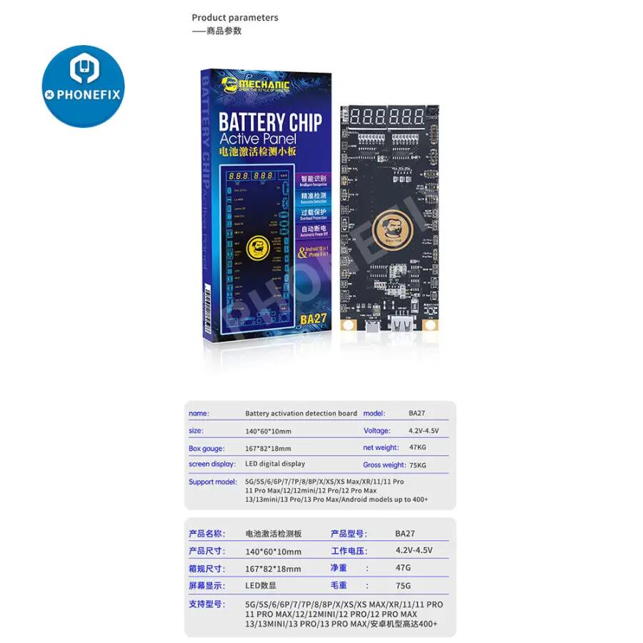 Mechanic BA27 Battery Fast Charging Activation Detection Board for iPhone 5-15 PRO Max Samsung Xiaomi Huawei Android Phones One-click Activation. Phonefix HW-29 battery charging activation detection board supports one-click activates iPhone 5-15 Pro Max and android s battery. Mechanic BA27 Battery Activation Detection Board For iPhone 5-15 Pro Max and Android Cell battery Repair.