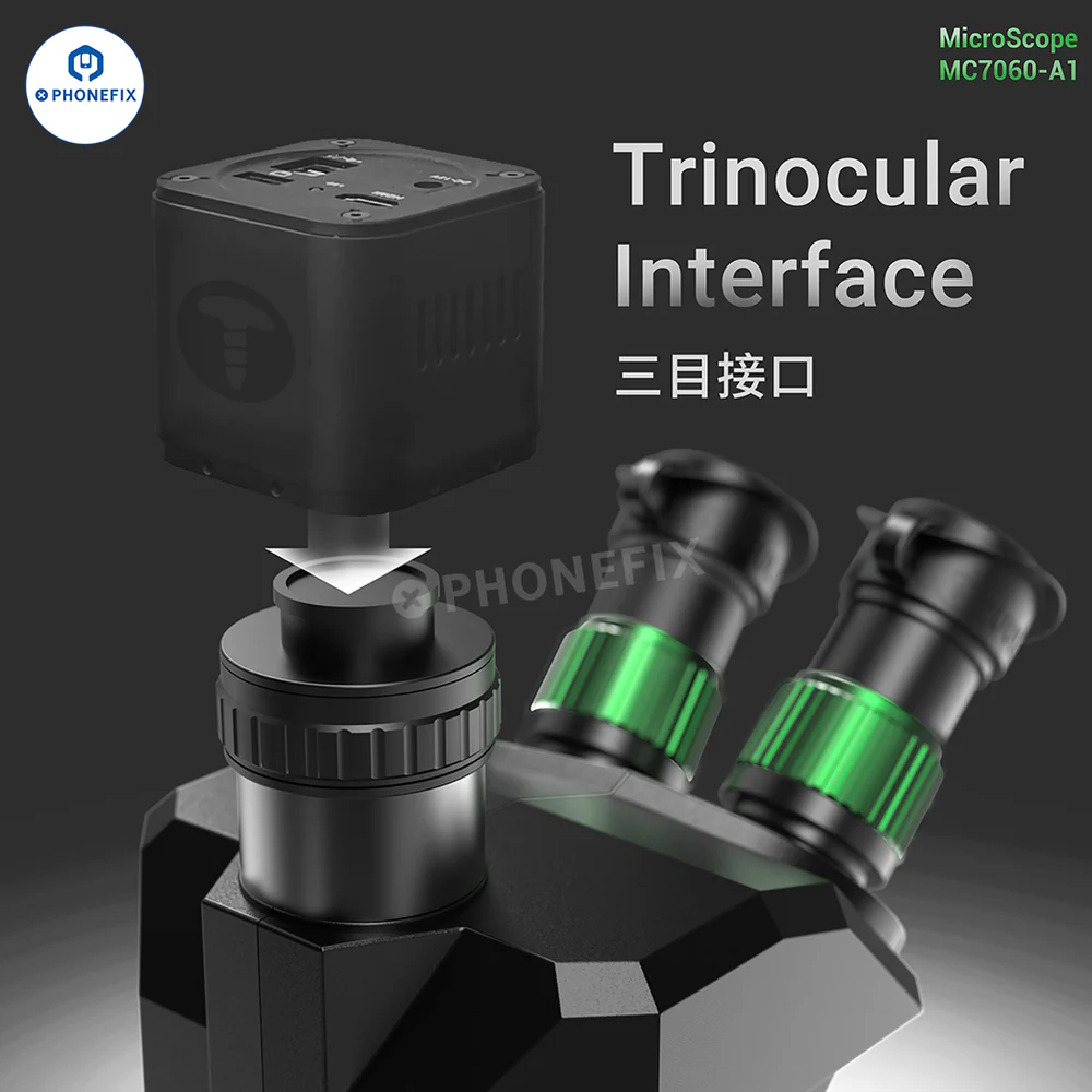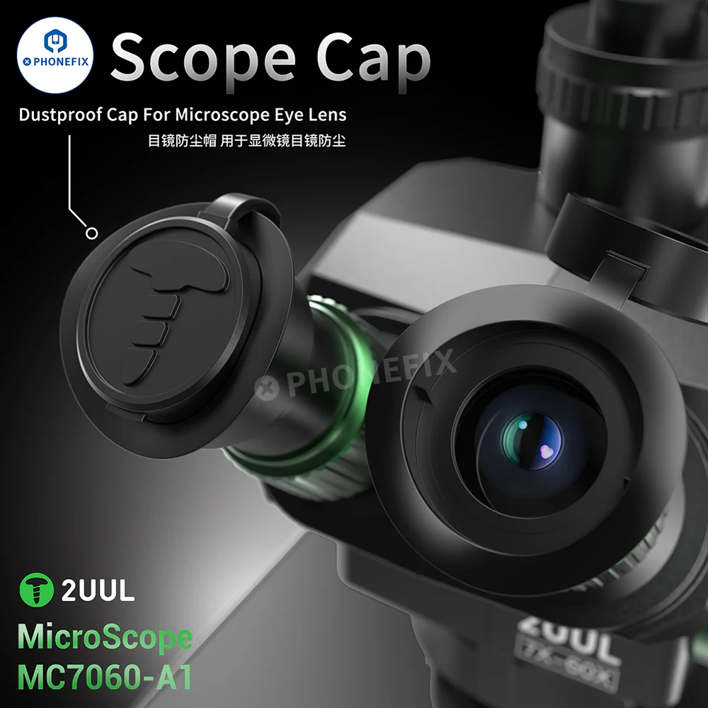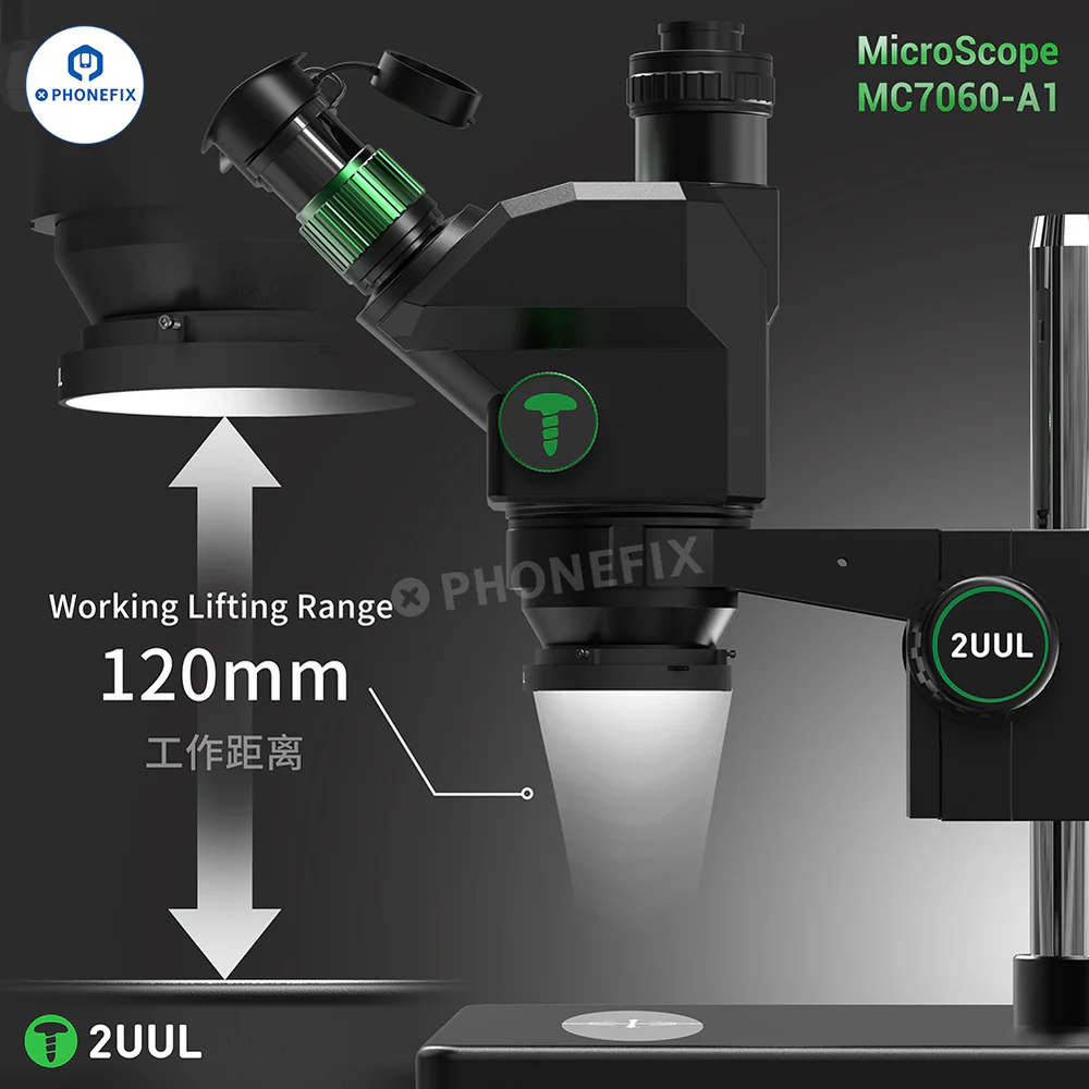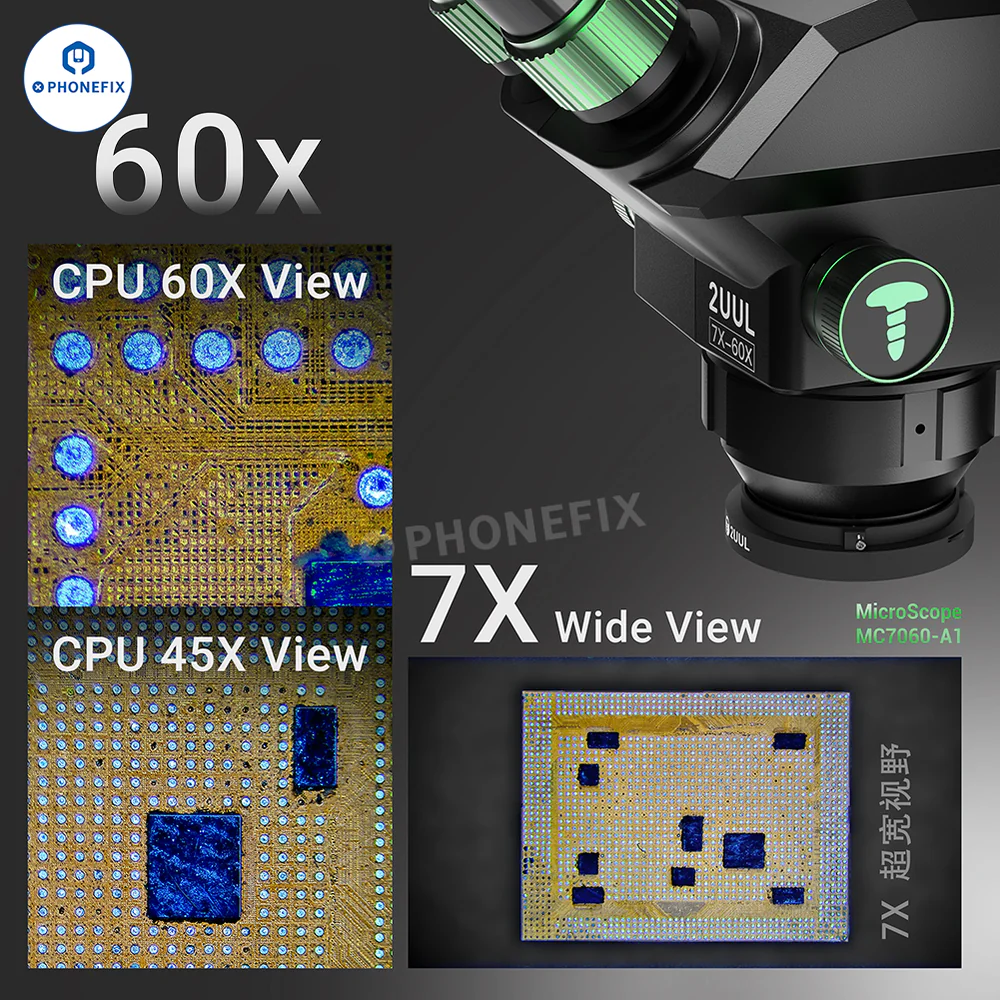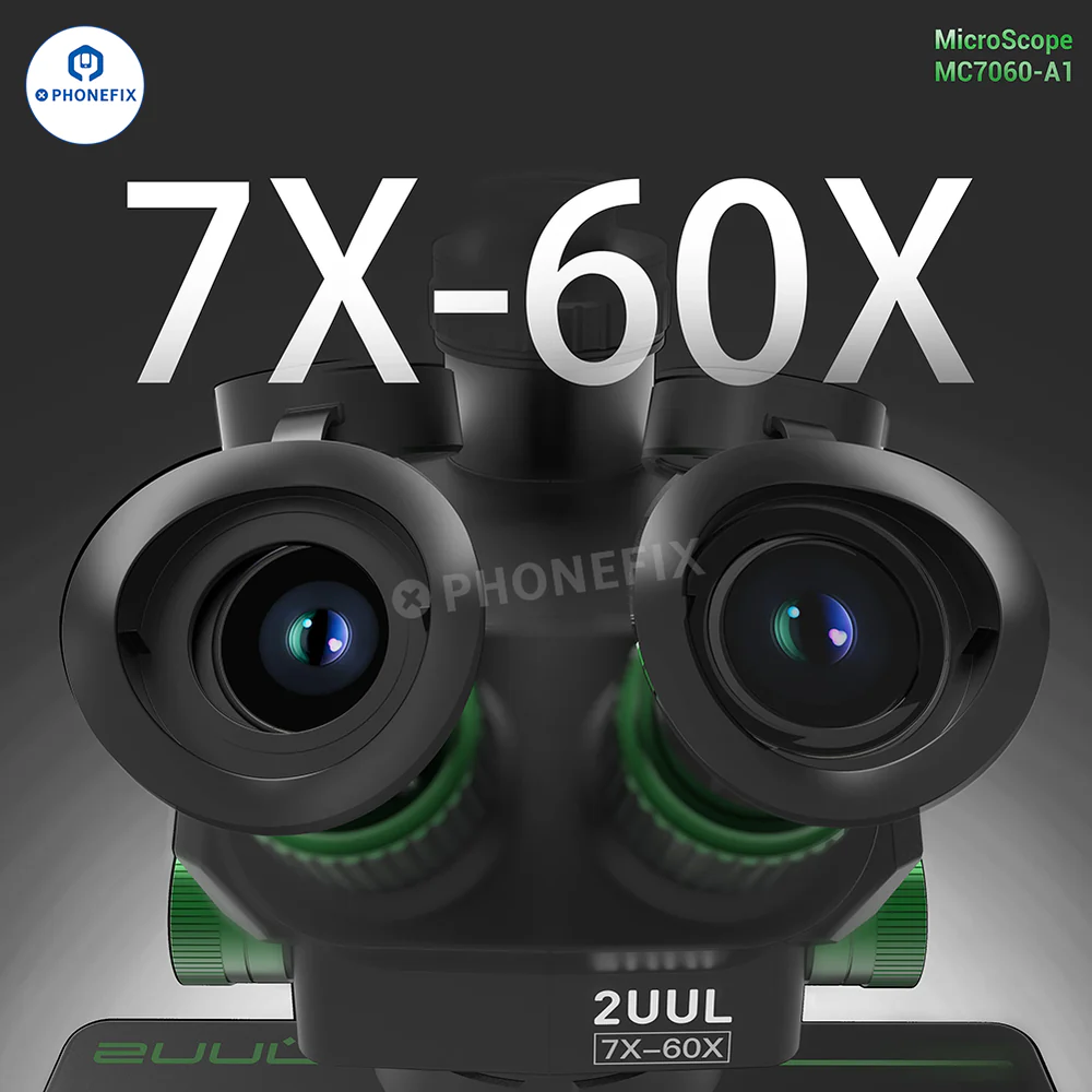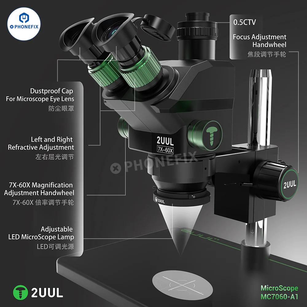 2UUL MicroScope MC7060-A1 7X-60X Synchronous Zoom Trinocular Stereo Microscope for Mobile Phone PCB Micro-soldering Work. 2UUL 7-60X Trinocular Microscope with WF10X/23mm eyepieces, 0.5X CTV lens adapter, adjustable ring lamp and last base, can be used with 4K HDMI cameras, suitable for welding and repairing CPU BGA chips on motherboards of mobile s and other electronic products.