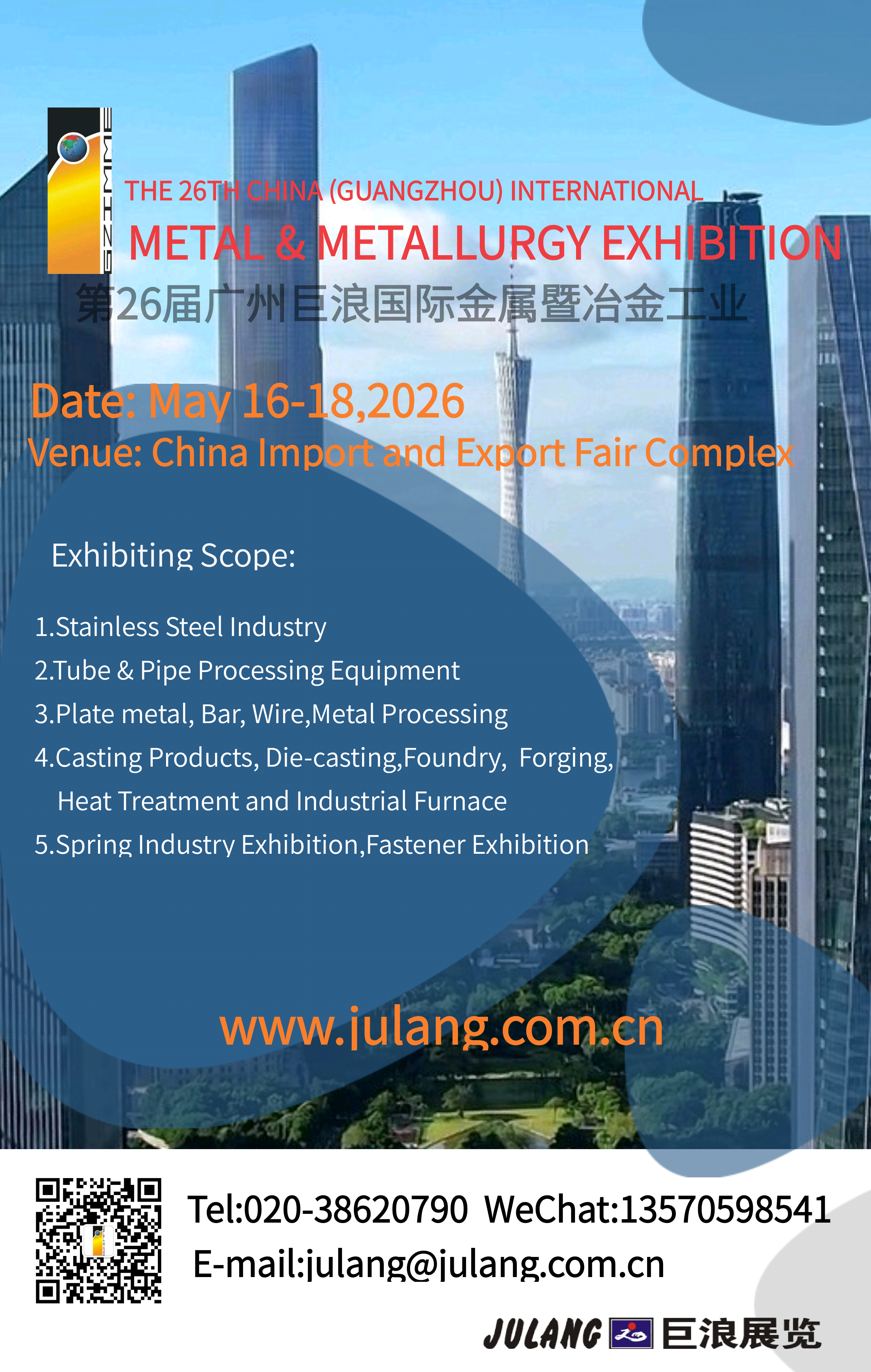 In the past twenty five years, the exhibition successfully played its role in industry trade boost. It has attracted 300,000 professional purchasers, been attended by over 30 countries business departments, and been issued by more than 300 medias.“2026China(Guangzhou) International Metal & Metallurgy Exhibition”will be heldfrom 16 to 18 of May,2026at Pazhou Complex-the largest exhibition center in Asia.