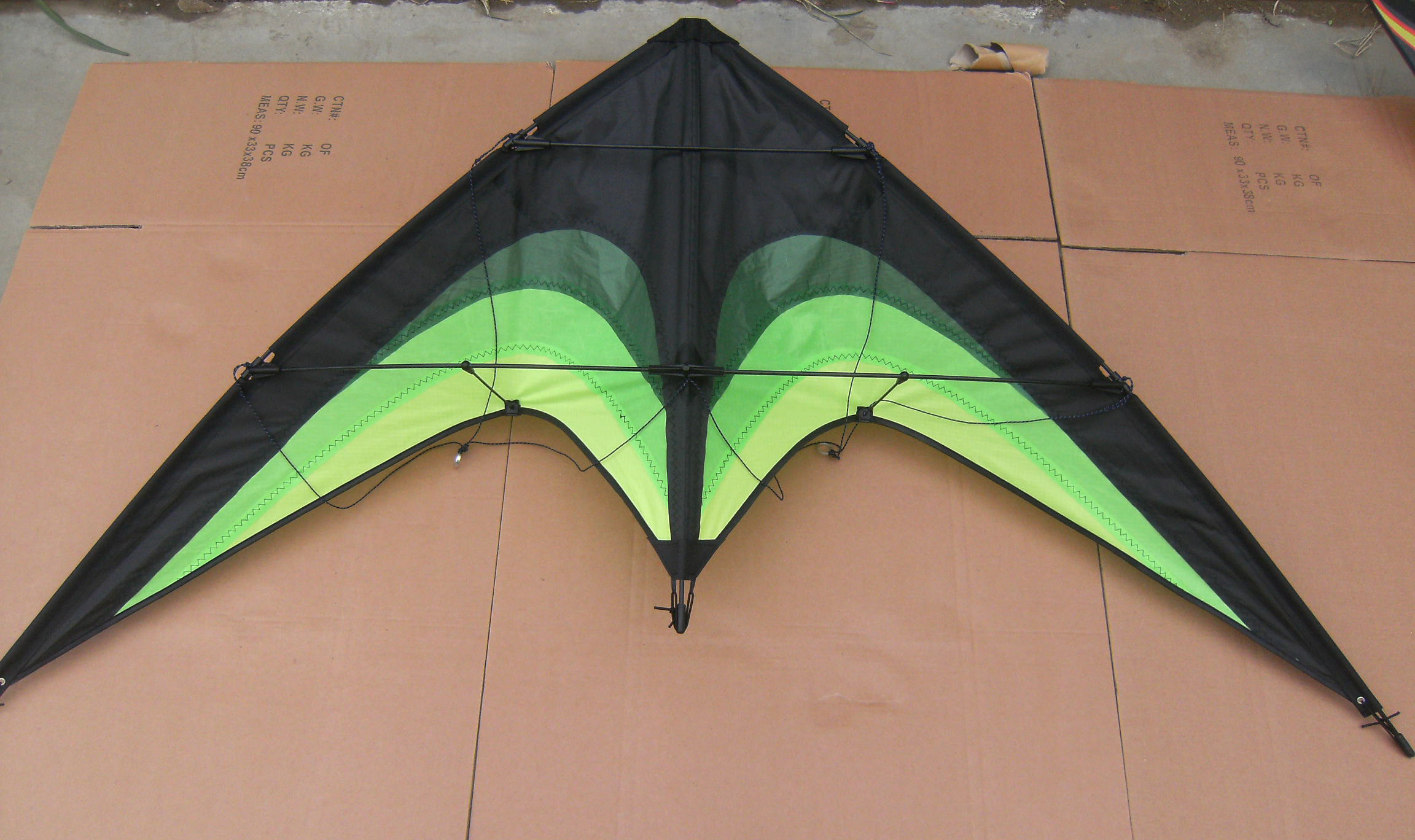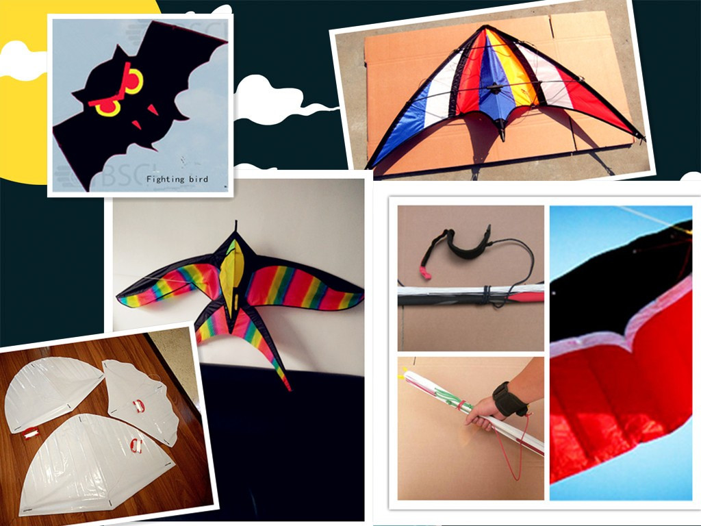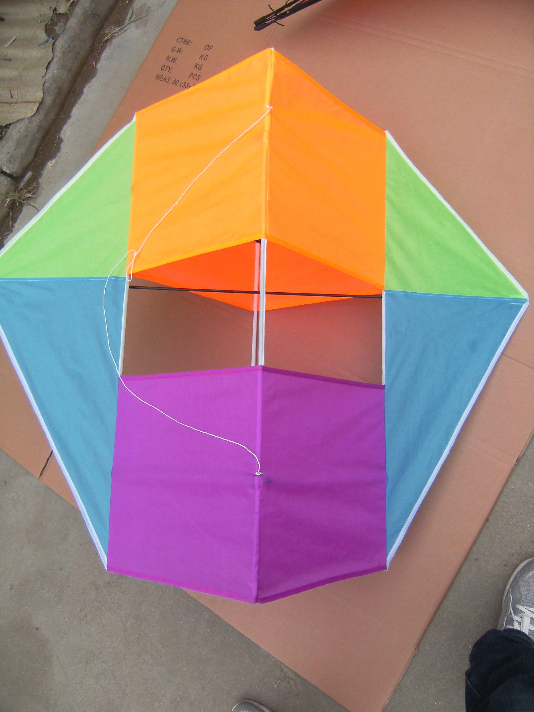 | kite | Kite materials: Fabric:Polyester ripstop 210T with PU coating. Poles : Fiberglass poles Package : clear plastic/fabric bag, PET pie box and foild b... |