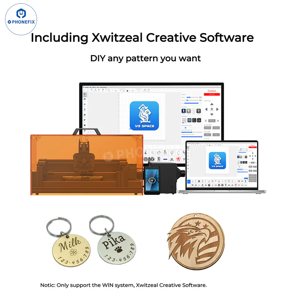 Xwitzeal V8 Ultra Auto-Focus Laser Machine with Mold and Smokeproof Shell for iPhone 8/X/11/12/13/14/15/16 Pro Max Back Cover Glass Removal and Repair. Xwitzeal V8 Ultra laser machine back glass glue removal and engraving 2-in-1 machine with 5.5W+5.5W laser power. One-click positioning, autofocus, high-speed rails.