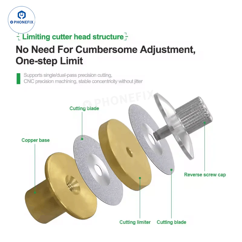 Прецизионная режущая головка Relife RL-090 для резки различных изогнутых экранов и чехлов. Режущая головка Relife RL-090 совместима с большинством очистителей клея OCA для ремонта ЖК-дисплеев мобильных телефонов.