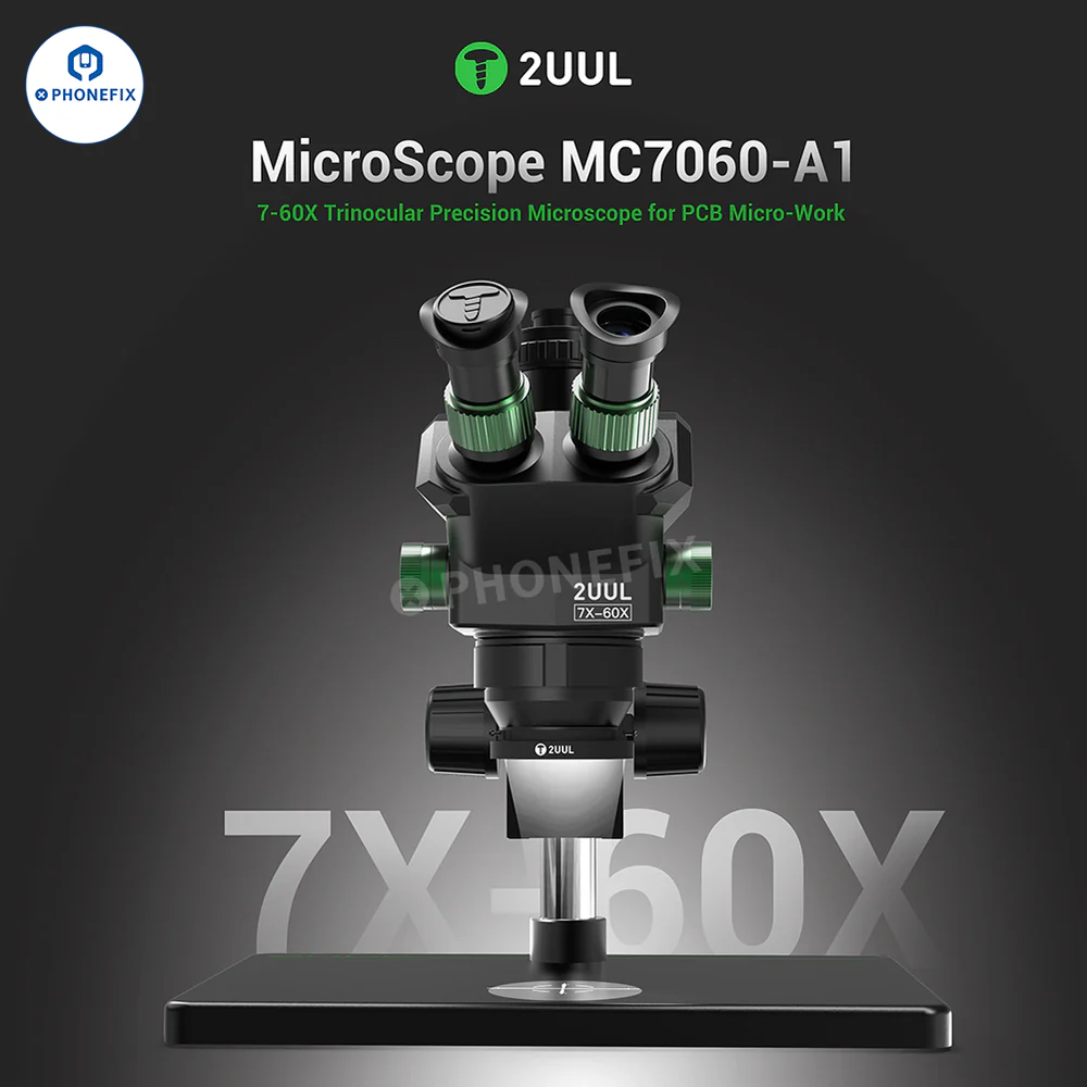 2UUL MicroScope MC7060-A1 7X-60X синхронный зум тринокулярный стереомикроскоп для микропайки печатных плат мобильных телефонов. 2UUL 7-60X тринокулярный микроскоп с окулярами WF10X/23 мм, адаптером объектива CTV 0,5X, регулируемой кольцевой лампой и последней базой, может использоваться с камерами 4K HDMI, подходит для сварки и ремонта микросхем CPU BGA на материнских платах мобильных телефонов и других электронных продуктов.