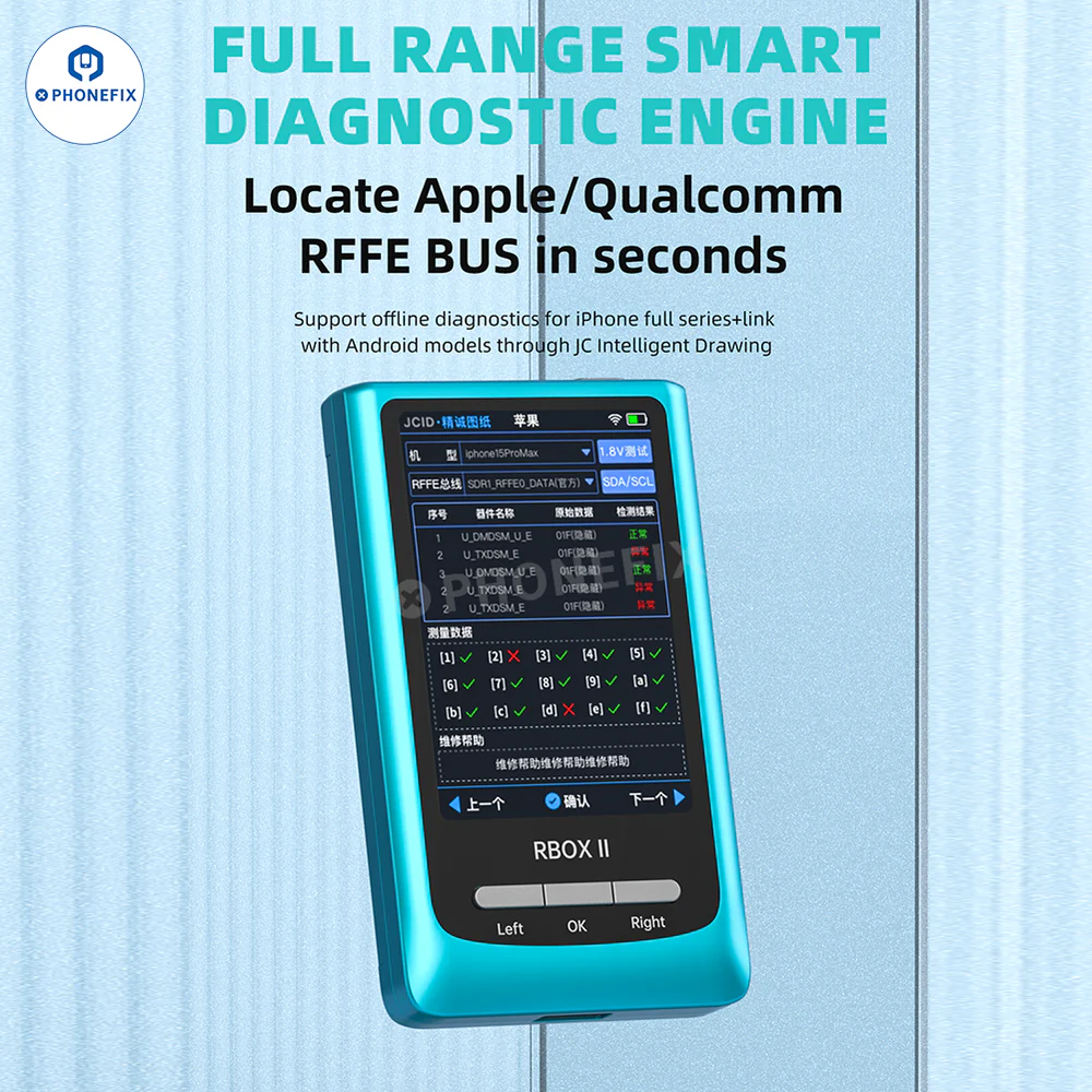 JCID-RBOXII Smart Diagnostic Instrument определяет местоположение шины Apple/Qualcomm RFFE за считанные секунды. Поддерживает автономную диагностику всей серии iPhone и стыкуется с моделями Android через JC Smart Drawing. Он может определять местоположение Apple RFFE на одной машине, считывать и записывать чипы основной полосы частот на одной машине и измерять IC. Точно улавливает аномальные сигналы, такие как отключение материнской платы/ложная пайка.